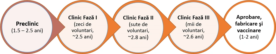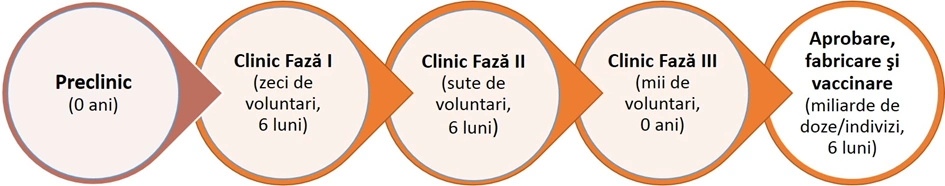 Şi ca să înţelegem ce este posibil şi ce nu, trebuie să detaliem puţin. Prima etapă este cea de cercetare preclinică, în care se selectează tehnologia care va intra în componenţa vaccinului şi apoi se testează eficienţa şi profilul de siguranţă pe celule umane (in vitro) şi pe modele animale (in vivo). Dacă in vitro efectul anti-infecţios este cel aşteptat şi nici nu mor excesiv de multe celule, se trece la studii in vivo, pe animale*.