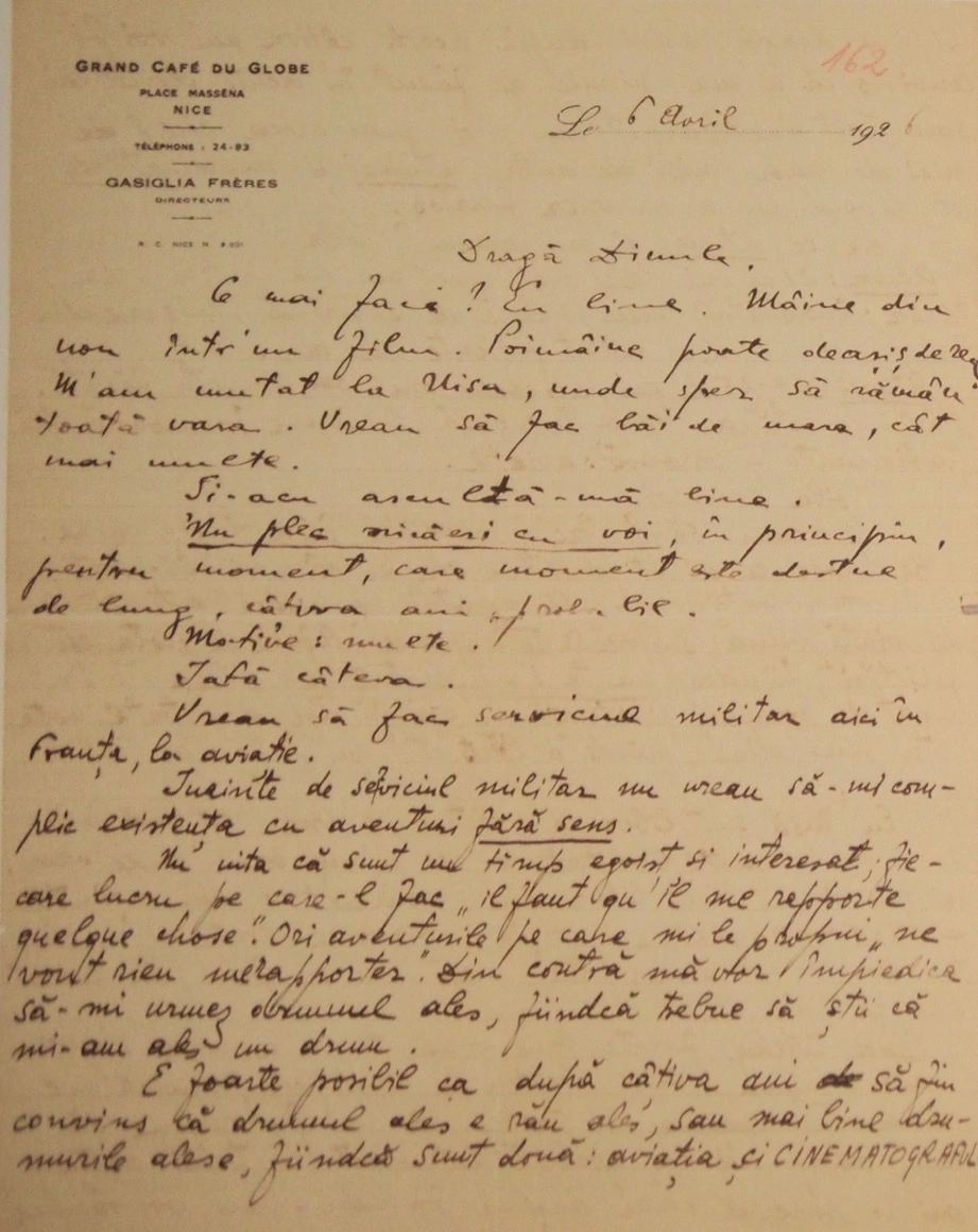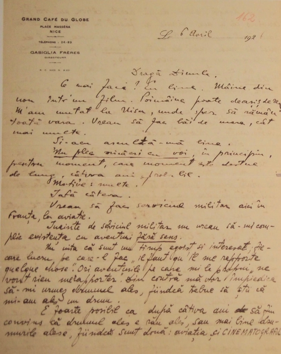 Prietenia lor continuă, dar scrisorile sunt mai rare. La începutul lui 1926, la distanță de un an și câteva luni de la sosirea în Franța, Eli îi scrie din Nisa. Îi povestește că a avut un „mic rol” într-un film și că în alte două săptămâni urmează alte două „mici roluri într-un alt film”. Îl întreabă de România, dacă s-a întâlnit cu cineva din familia lui.