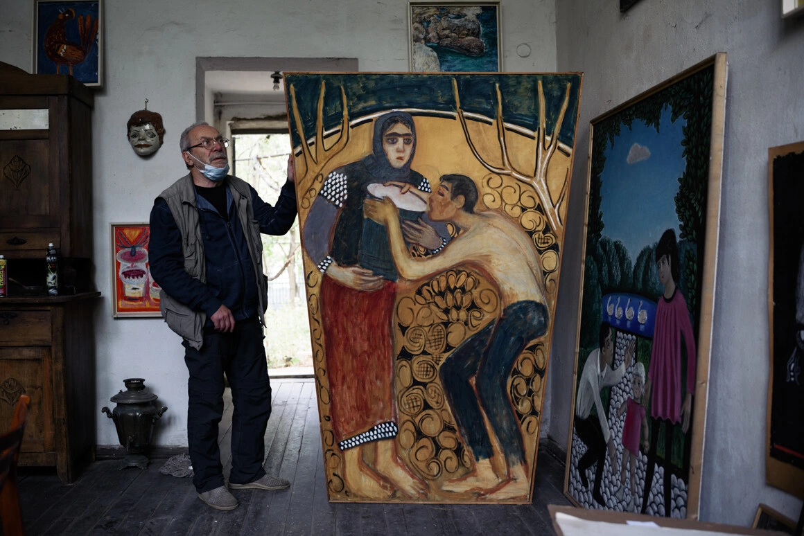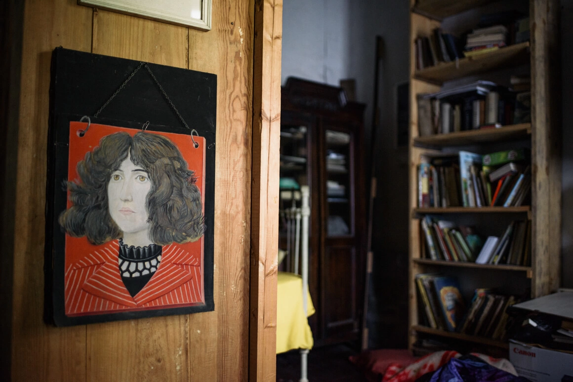 De pe la 70 de ani, când a lăsat-o vederea, Valentina Rusu Ciobanu a încetat să picteze. Asta i-a schimbat și relația cu lucrările sale și cu pictura. „Acuma nimic nu-mi mai e drag, eu nu le mai văd… Dar când lucram, atunci îmi erau dragi ele toate,” mi-a spus artista, într-o înregistrare făcută de fiul său. Din cauza coronavirusului, nu m-am putut apropia să vorbesc direct cu ea, așa că am comunicat de la distanță. Totuși, cât am stat în grădină de vorbă cu Lică, am putut s-o observ pe Valentina Rusu Ciobanu de departe, vorbind cu nora sa despre gherghinele pe care i le adusesem și pe care Lică le așezase într-un borcan de trei litri. Din pragul ușii, în baston și cu pași lenți, artista a traversat apoi grădina ca să așeze, cu mișcări exacte, rufele pe ață, în aer liber. Când s-a întors spre casă, m-a țintit cu o privire curioasă, de parcă încerca să înțeleagă dacă mă cunoaște.