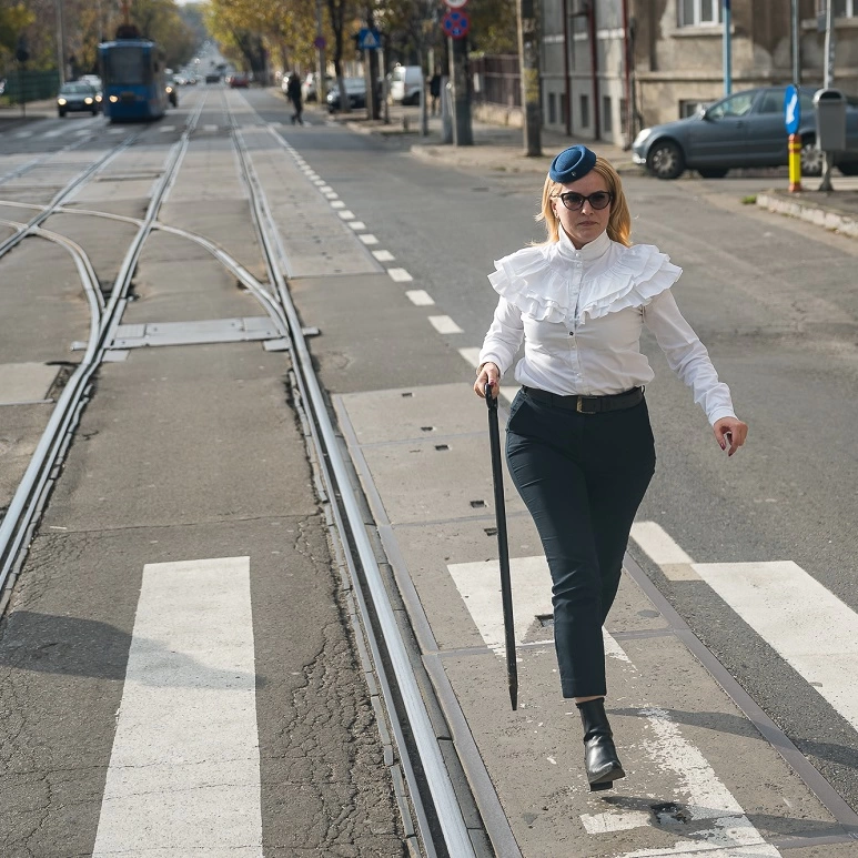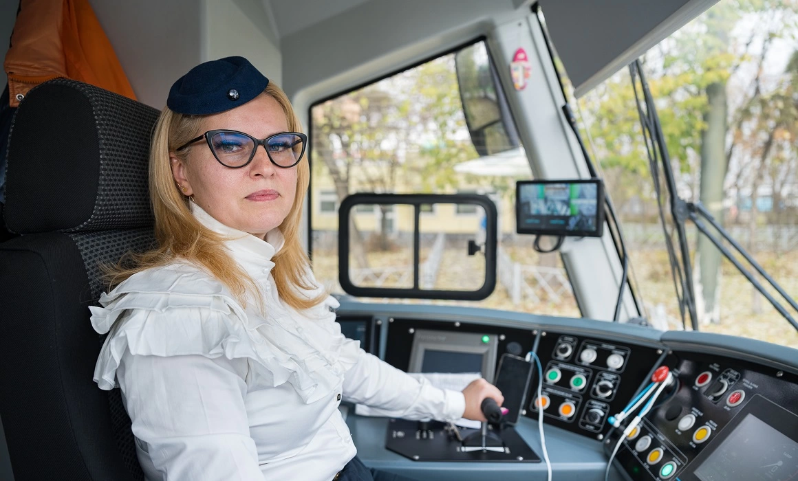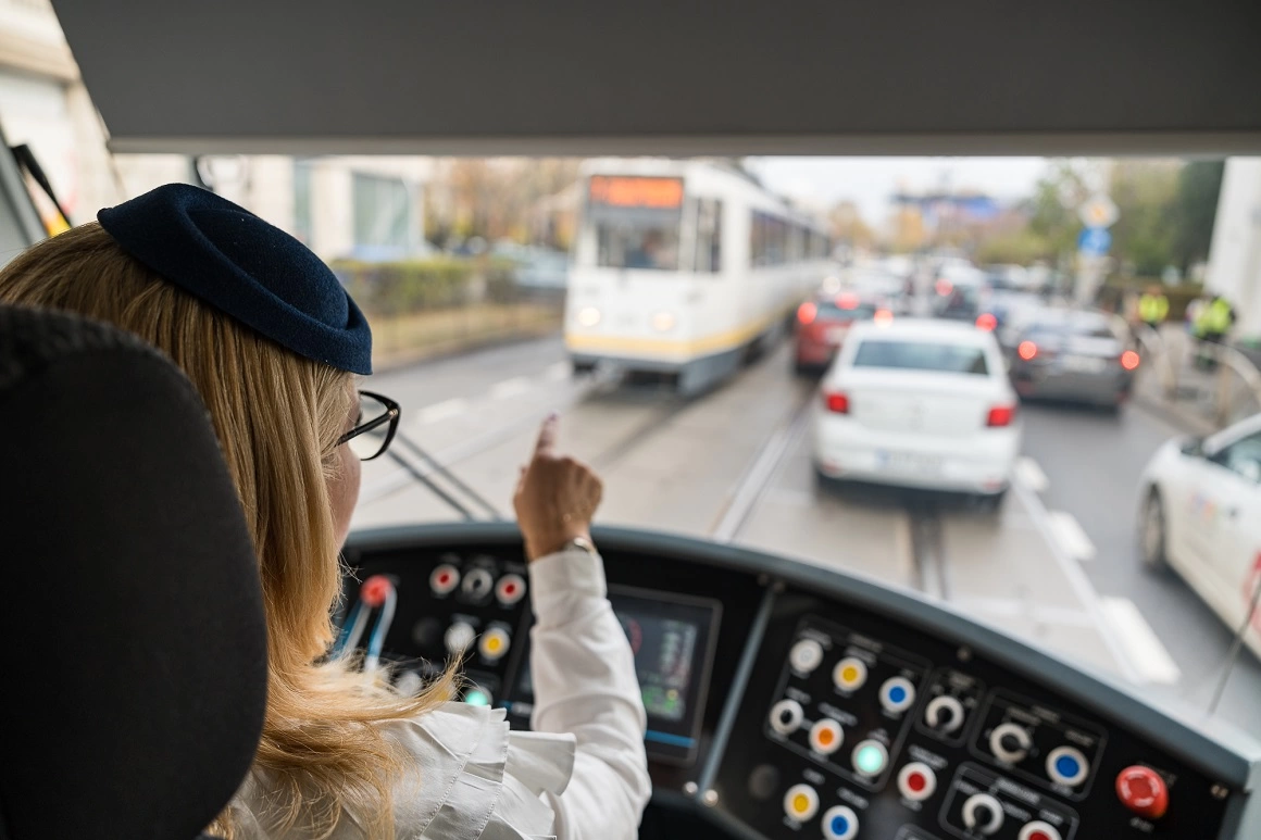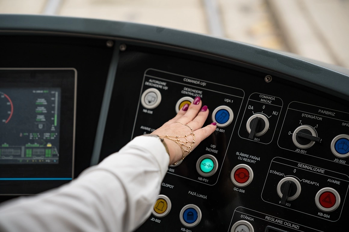 „Colegul din față pleacă la și un minut, iar la și cinci trebuie să plec eu.” În prima stație, cea de la depou, cineva de pe peron pare că o salută din priviri. „Tot timpul îmi zâmbesc călătorii. Nu toți, dar unii care au început să mă recunoască”, îmi povestește. Poartă o cămașă albă cu volane, o tocă bleumarin, iar la mână are un accesoriu auriu care acoperă palma.