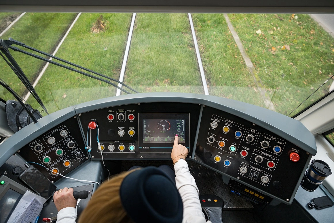 „N-avem curent în momentul ăsta, nici în fir, nici în linie. Avem 9 volți în baterie și mergem din inerție”, spune Elena și arată panoul de control. Astfel de situații au loc când sunt prea multe tramvaie pe linie și trebuie să fie atenți, să meargă încet, ca să nu frâneze brusc dacă apare ceva și apoi să rămână blocați până revine curentul.