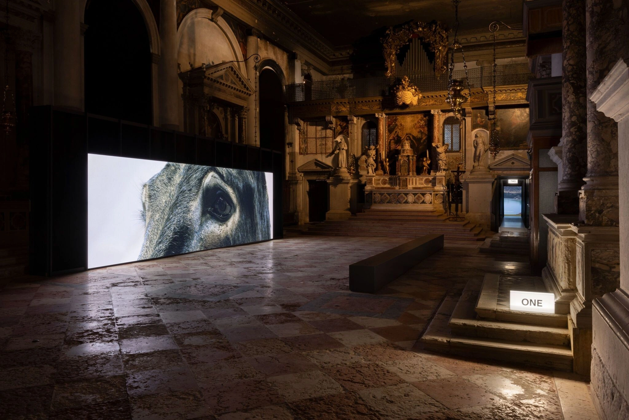 Prima parte a dimineții mi-o petrec la Complesso Dell'Ospedaletto, o arhitectură hibridă între un fost spital construit în 1517 și biserica Santa Maria dei Derelitti. Aici este găzduită expoziția Penumbra, organizată de Fondazione In Between Art Film, care prezintă opt lucrări video pe tema comunităților globale/ locale. O mențiune specială merge către instalația video Pantelleria (2022), a duo-ului de artiști Masbedo, care povestesc despre operațiunea Corkscrew (1943) – bombardarea insulei Pantelleria de trupele aliate în prima operațiune de recucerire a Italiei, printr-un proces participativ de redescoperire a memoriei istorice împreună cu localnicii.