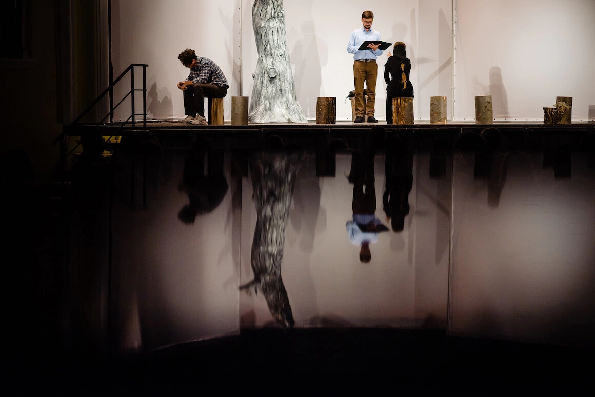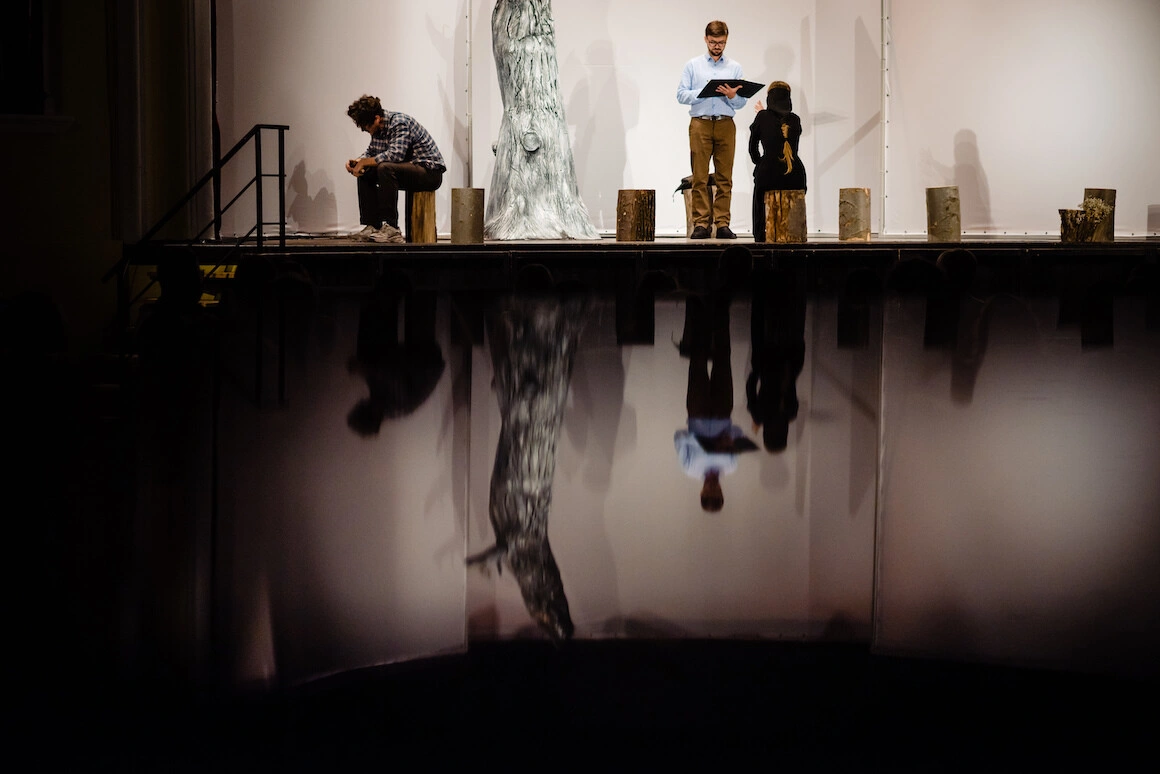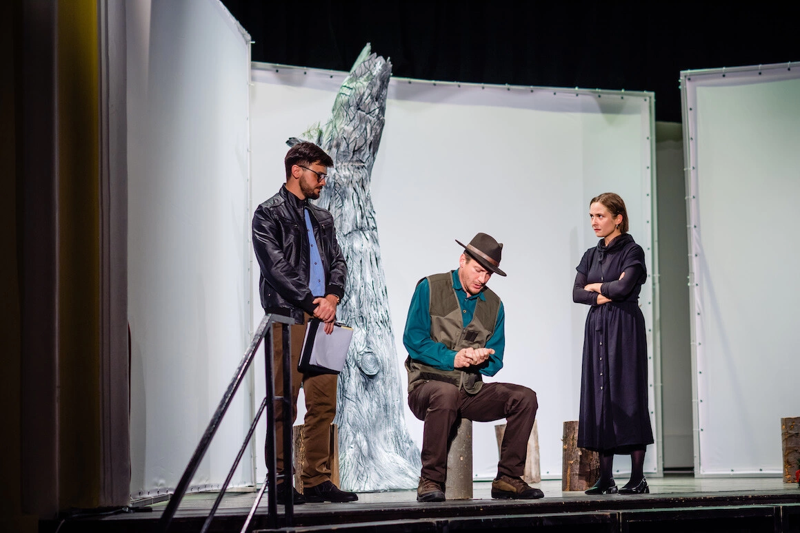 Toți actorii fac o creație din limbă, folosită în dialectul local și devenită aici element de scenografie sonoră. Sonorități tensionate, de suspans, și vocea victimei interferează cu folclorul local, în special doine, care localizează acțiunea, dar îi dau și o patină atemporală. Pare că de la Miorița încoace, crima a devenit un mod tolerabil de îmbogățire. Scenografia funcționează în cheie minimalistă – un spațiu populat cu trunchiuri tăiate de copaci, ale căror coroane se văd fantomatic pe fundal, într-un video filmat din perspectiva victimei, adică din poziția în care a fost ucisă. La acțiunea electorală de împădurire demarată de primar, pe trunchiurile moarte ale copacilor sunt altoite crengi, un gest la fel de nenatural ca retorica populistă a edilului. Adina Lazăr navighează elegant printre specificități locale – accente, muzici, obiceiuri – și o universalitate a răului. Crima reală s-a reprodus, de fapt, de mai multe ori, și este doar fața vizibilă a unui rău major, la care statul și comunitatea sunt complici, unul prin corupția instituțiilor, alta prin tăcere.
