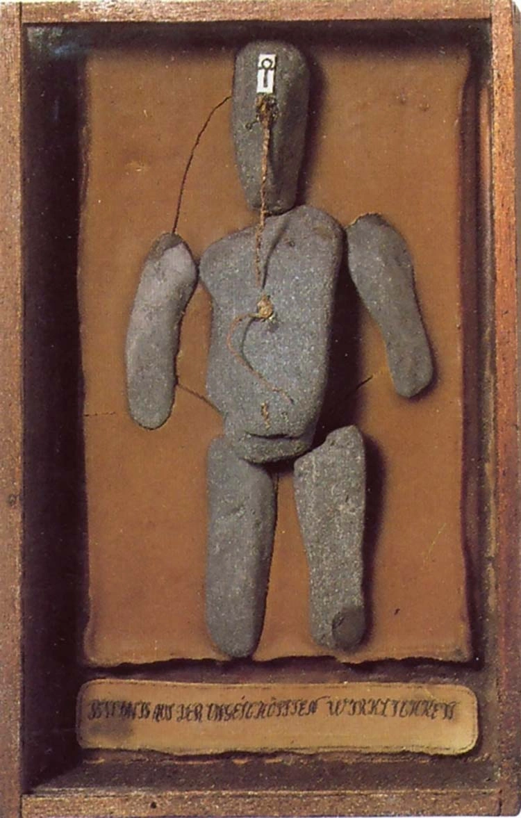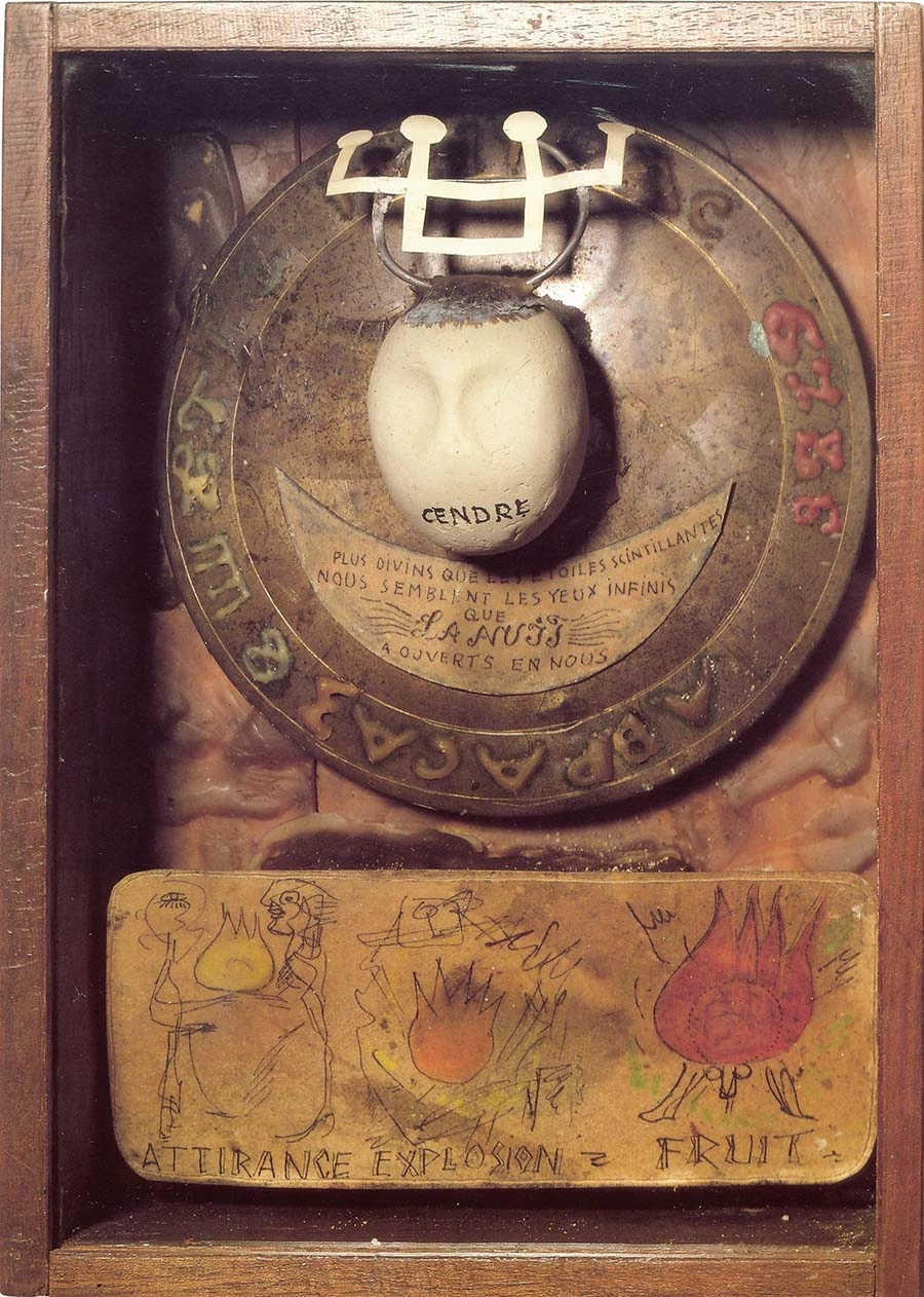 Victor Brauner pare să fi așteptat momentul propice pentru a accentua, în operă, relația dintre poezie și magie. Sensul cuvintelor introduse adeseori în imagini este criptat prin folosirea unor litere preluate din alfabetele limbii ebraice, adamice, cele ale alfabetului „celest” și al scrierii „în lunete”, care au ca scop sublinierea caracterului secret al imaginii. În Portret al realului increat (1943), obiect realizat prin asamblarea pietrelor pe care Brauner le găsește în albia rîului Durance din apropierea localității Celliers-de Rousset, artistul conferă viață omulețului din piatră, punîndu-i pe frunte o etichetă pe care desenează simbolul Ankh, simbol al vieții în hieroglifele egiptene. Ansamblul de pietre pe care Brauner îl descoperă în albia rîului devine, datorită intervenției artistului, imagine creată, un asamblaj ready-made avînd contururile figurii umane.