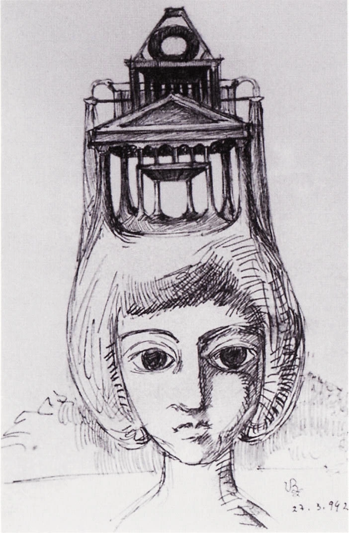 Una dintre pînzele pictate în localitatea Celliers-de Rousset, unde Brauner s-a ascuns în timpul războiului. reproduce fidel podul care leagă malurile rîului Durance, așezat pe capul unei tinere fete, în chip de „coafură“. Un desen în creion reia arhitectura podului pentru a încorona o figură feminină simbolizînd trecerea de la o lume la alta, de la real la ireal, de la cotidian la fantastic sau miraculos. Un alt desen, în peniță, este portretul imaginar al Iuliei Hașdeu, unica fiică a savantului Bogdan Petriceicu Hașdeu. Înzestrată cu calități excepționale, Iulia Hașdeu studiază la Sorbona, urmînd să fie cunoscută îndeosebi ca poetă. Suferind de tuberculoză, s-a stins din viață în anul 1888, la numai nouăsprezece ani. Interesul manifestat de Hasdeu pentru spiritism și cavoul Iuliei, construit ca un mic templu, trebuie să fi hrănit pentru multă vreme imaginația tînărului Victor Brauner care, în adolescență, avea obiceiul să picteze vedute în împrejurimile Cimitirului Bellu. În 1942, cînd pictorul realizează Portretul imaginar al Iuliei Hașdeu, „coafura“ reproduce construcția „templului“ consacrat de Hasdeu fiicei sale în Cimitirul Bellu. Exteriorul (partea vizibilă a construcției) și interiorul (cripta) templului pe care Brauner îl vizitase în adolescență formează arhitectura delicată a coafurii din desen.