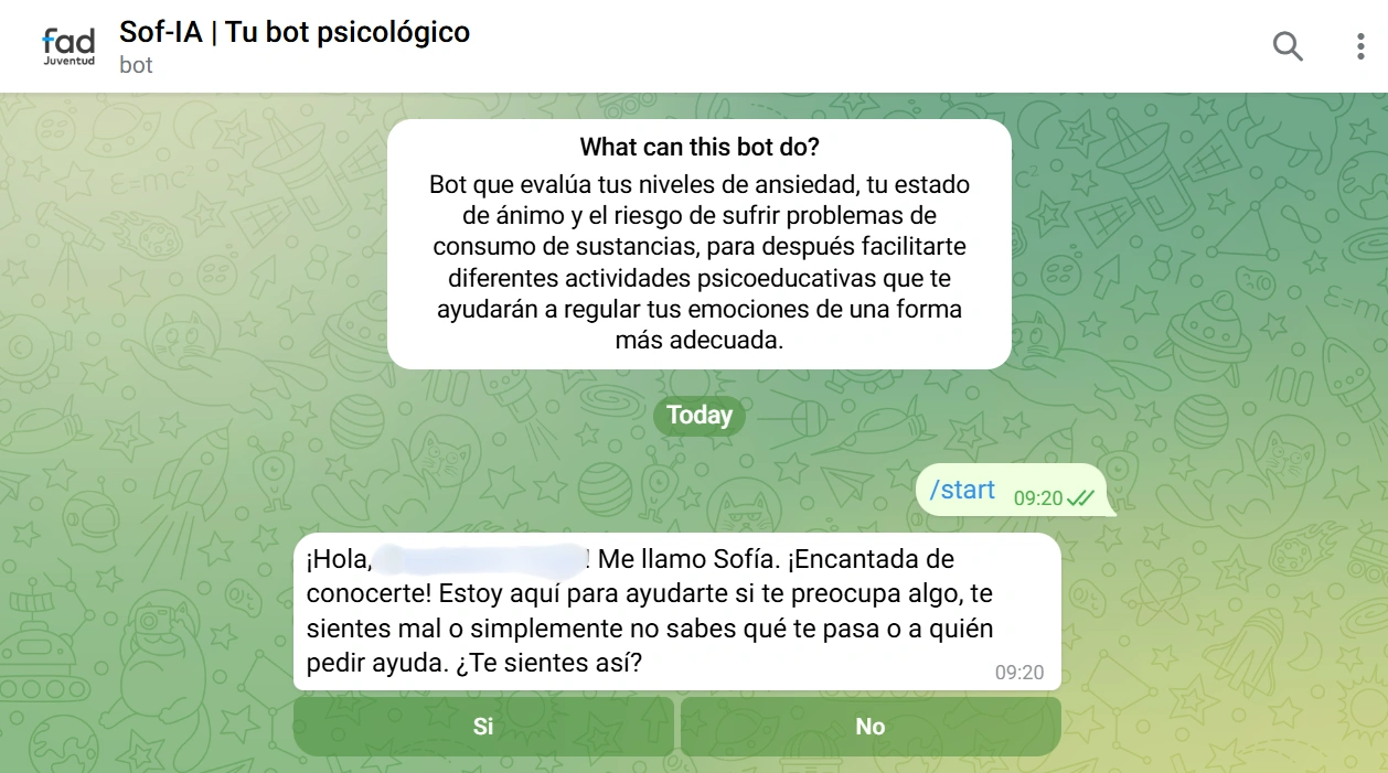 Pe de altă parte, inteligența artificială poate face parte și din soluție. Una dintre inițiativele bazate pe AI dezvoltate în Spania este Sof-IA, chatbot-ul fundației Fad Juventud. Acest chatbot „gestionează întrebări legate de consumul de substanțe, precum și de suferința emoțională, inclusiv situații de violență digitală”, conform explicației fundației pentru Maldita.es, și este conceput pentru tinerii care „nu vor sau nu îndrăznesc să scrie unui serviciu cu personal uman sau preferă anonimatul conversației”. De la lansarea sa în 2024, Sof-IA a gestionat peste 800 de interogări, conform fundației, deși inițiativa are încă limitări precum lipsa de interactivitate, conținutul „oarecum scurt sau simplu” și faptul că chatbot-ul este implementat doar pe Telegram.