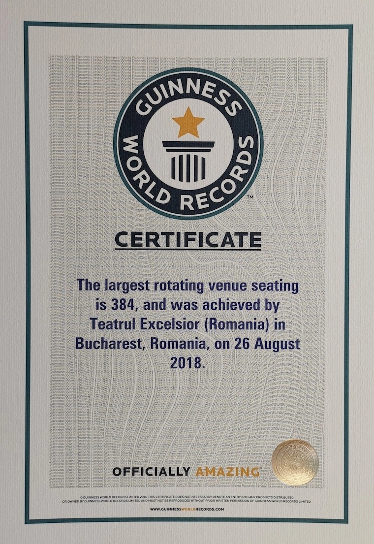 „Teatrul Excelsior devine de astăzi primul teatru din România cu un record oficial înscris în Guinness World Records! Este o premieră nu doar pentru acest fel de a prețui cultura din țara noastră, ci și pentru cei de la Cartea Recordurilor întrucât, până să înscriem noi acest record, cei de la Guinness nu notau un eveniment asemănător. Dacă cumva mâine, cineva vrea să ne depășească, istoria va nota că noi am fost primii.”