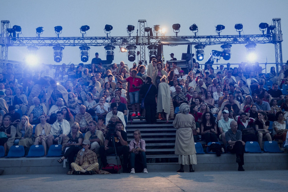 Cineva din echipa teatrului aduce o mapă albastră în care se află certificatul de la Guinness World Records. Flori, pupături, aplauze. Toți cei din echipa spectacolului sunt rugați să urce pentru o poză de grup. În sală rămânem doar eu, Dinu Săraru și încă câțiva oameni. Restul sunt pe scenă, bucurându-se împreună de reușita celei mai mari gradene rotative din lume.