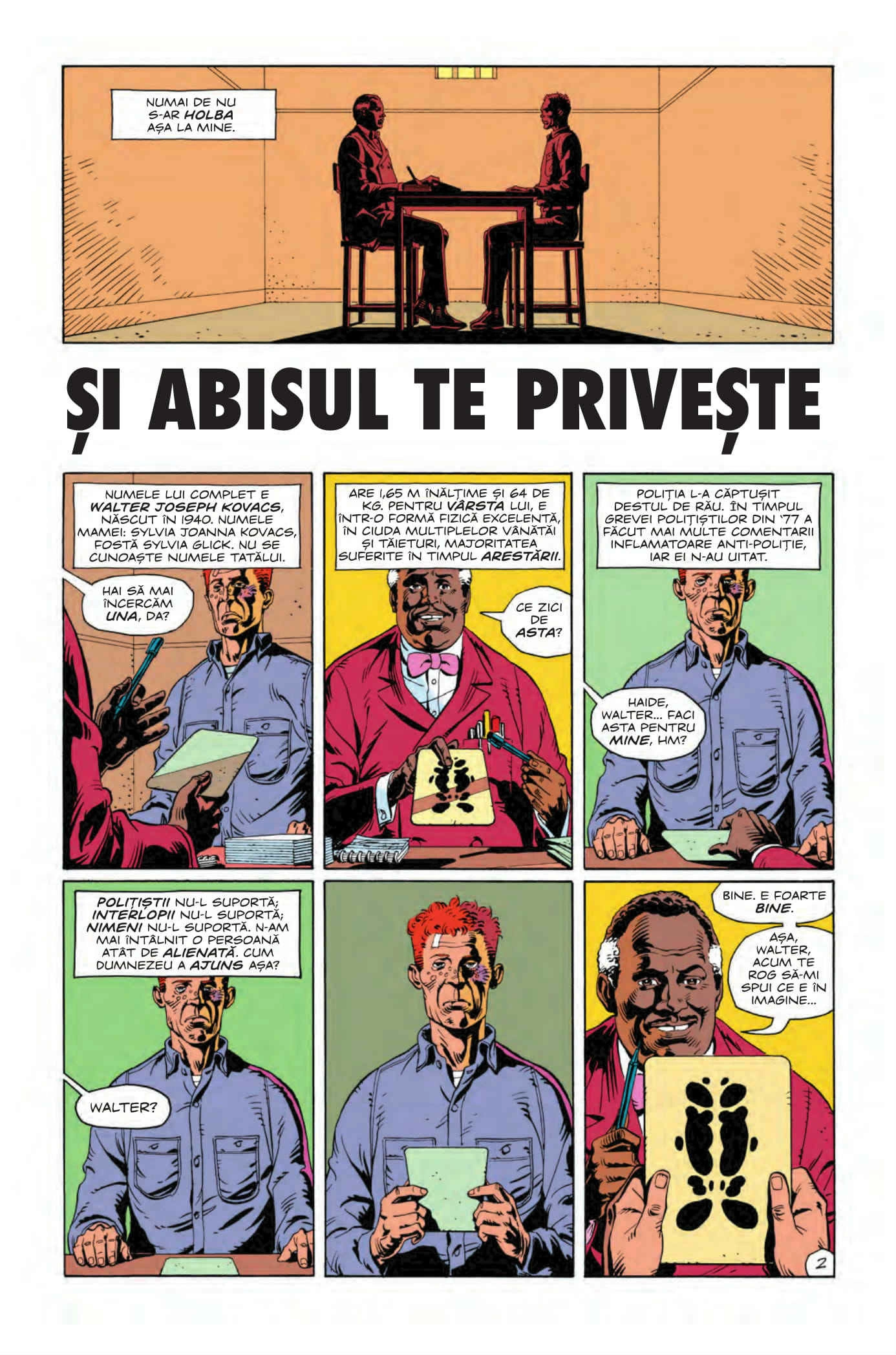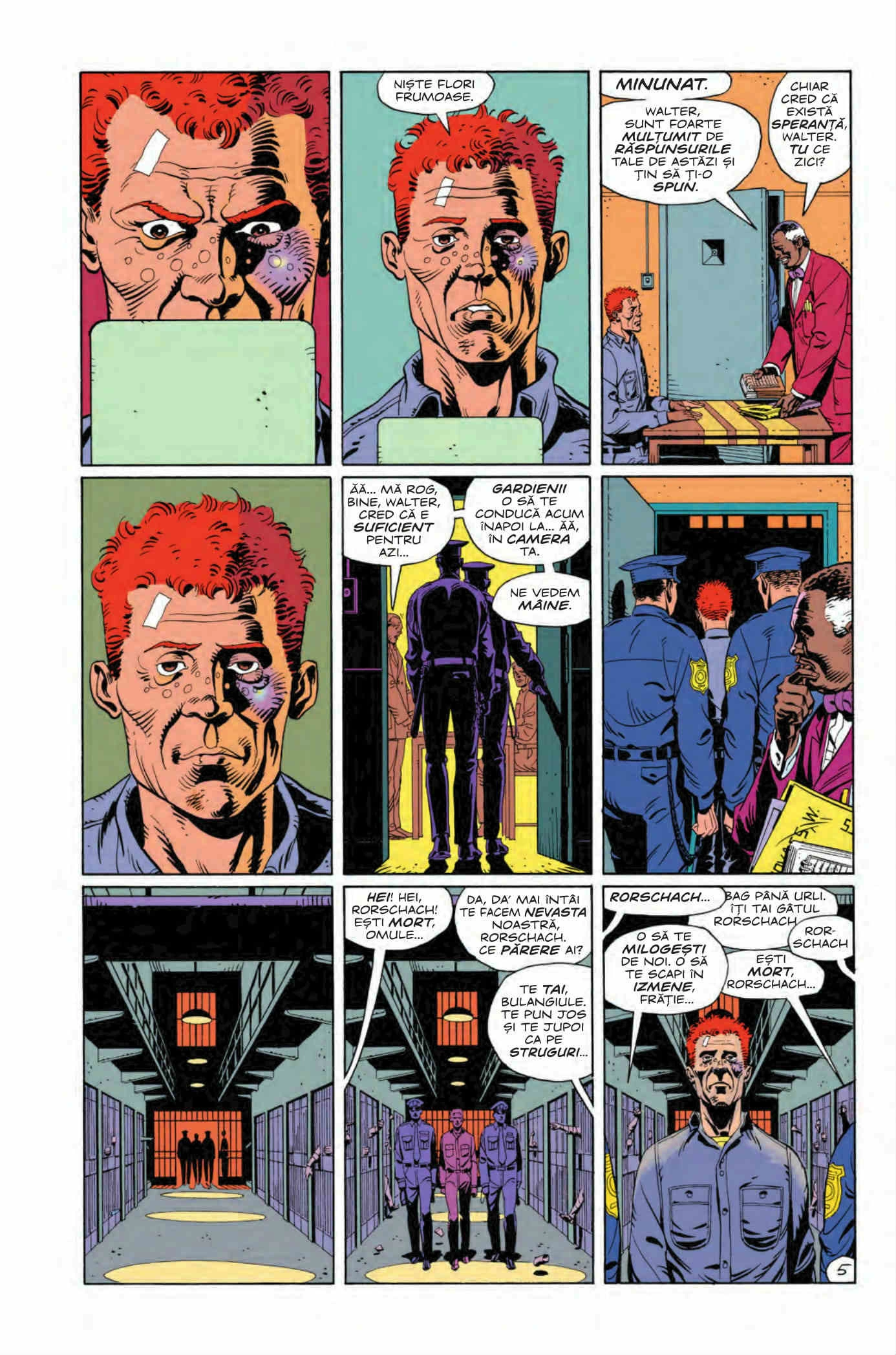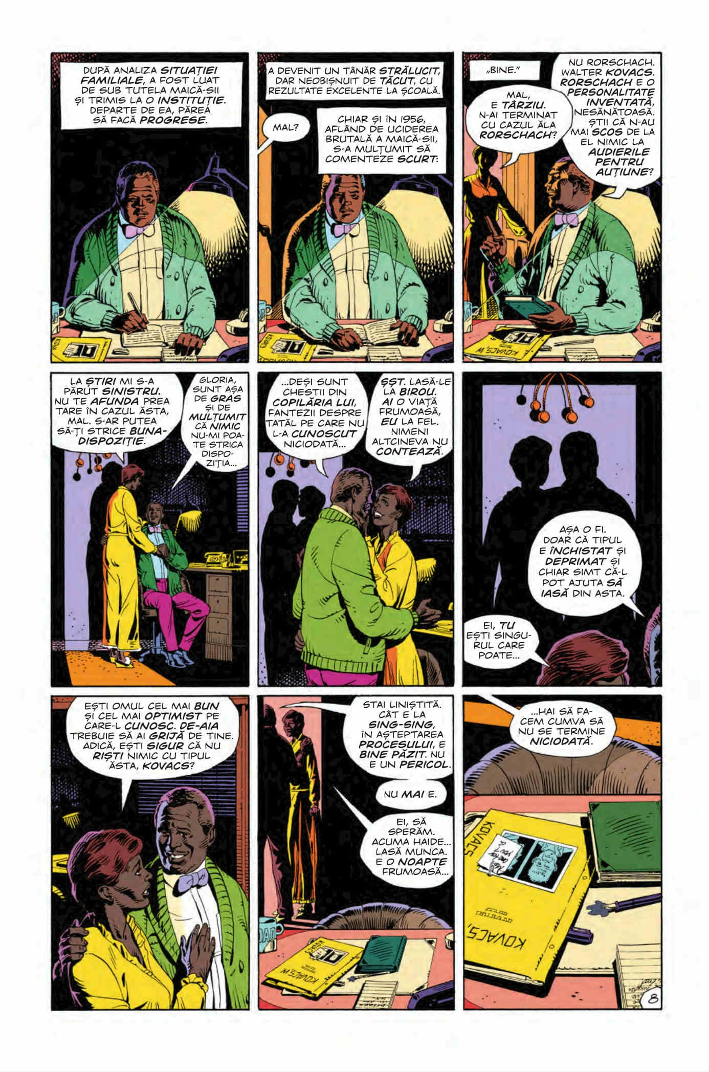 În anii '80, la vremea publicării ei, cartea asta a generat o revoluție în benzile desenate. Împreună cu alte câteva titluri, cum ar fi Maus de Art Spiegelman sau The Dark Knight Returns de Frank Miller, e considerată unul dintre cele mai puternice romane grafice (deși Alan Moore e foarte reticent față de termenul ăsta - roman grafic -, despre care crede c-ar fi mai mult o găselniță de marketing). Revista TIME a inclus Watchmen în topul celor mai bune romane din lume, de la 1923 încoace, alături de cărți ale unor scriitori ca Orwell, Philip Roth (RIP), Vonnegut sau Jonathan Franzen. Până vă faceți timp să (re)citiți - recviemul ăsta pentru supereroii clasici, vă propunem să citiți mai jos o parte din capitolul despre Rorschach. (Andra Matzal)