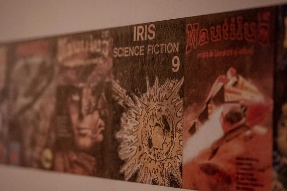 Trec mai întâi prin toate încăperile pe repede-înainte, așa cum fac când mă duc la împinge-tava și vreau să văd toate felurile de mâncare dintr-o singură mișcare. Apoi reiau turul, dar de asta fără să mă grăbesc. Încep cu camera fanzinelor („anticamera internetului”, după cum e descrisă), acolo unde sunt expuse zeci de publicații (Orion, Omega, Quasar, Super nova, Start 2001, Andromeda ș.a), coperte colorate cu un aer retro-erotico-distopic. De undeva se aude muzică, e ca hârâitul unui radio și vine dintr-un spațiu alăturat. Mă iau după sunet și identific sursa: „Expediţie în Crocobauritania”, prima operă rock SF de la noi, compusă în 1983 de Constantin Császár pe un libret de Ovidiu Pecican și Alexandru Pecican. Îmi place cum sună, nu seamănă cu nimic din ce știu și nu reușesc să o plasez undeva. Merge la fix aici, felul în care umple spațiul expozițional e discret și totodată bulversant.