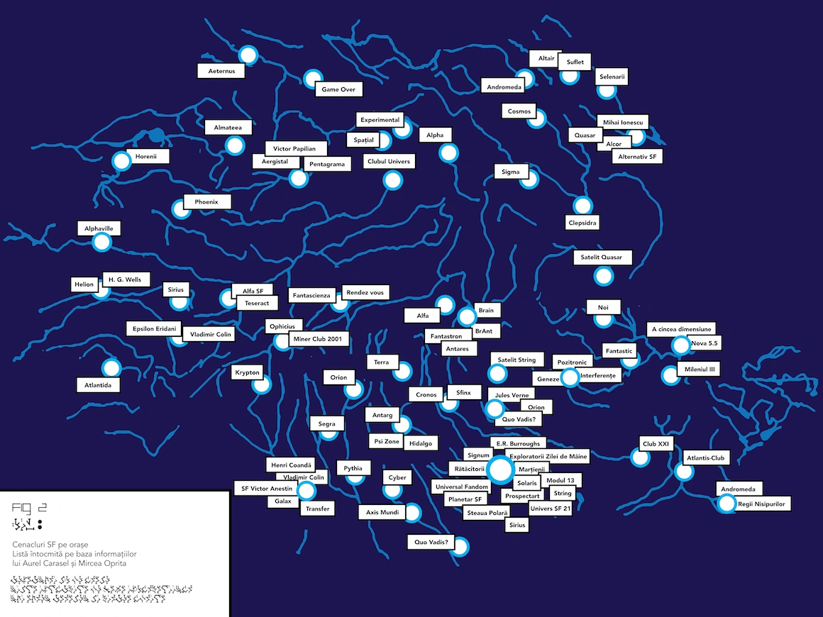 Vehemența cu care respingeam SF-ul e oarecum surprinzătoare, în condițiile în care în jurul meu aveam mulți oameni, precum frate-meu și gașca lui, care erau foarte implicați în fenomen. În anii ‘90, ei participau la emisiuni radio, unde discutau noaptea despre Frank Herbert și Philip K. Dick, scriau la rândul lor proze SF și aveau chiar și un cenaclu în Botoșani. Culmea e că nu mi-aș fi amintit de cenaclul respectiv, dacă nu l-aș fi (re)găsit acum în expoziția Timpuri Noi, pe o hartă a României care, în loc de sate și orașe, cuprinde doar nume de cenacluri SF, răspândite în toate colțurile țării. Sunt nume cu sonorități fascinante și contradictorii: Sfinx, Steaua Polară, Jules Verne, Clepsidra ș.a. Și undeva, în nord-est, suprapus peste județul Botoșani e cenaclul Suflet. Da, așa se chema: Suflet. Tresar când îmi dau seama, e ca un portal (înapoi) către anii ‘90.