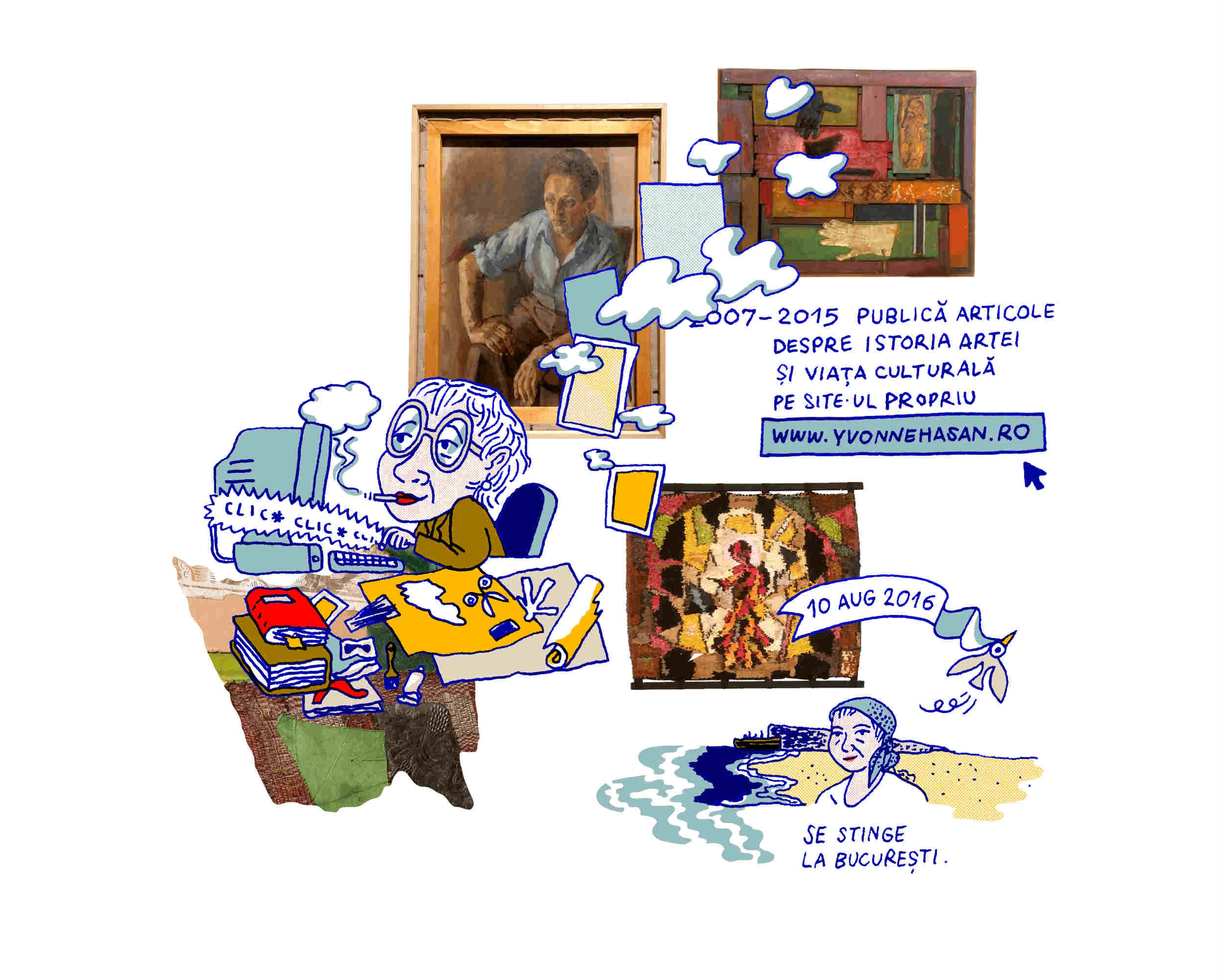 Pe scurt: Yvonne Hasan a fost țesătoare de imagini, pictoriță, profesoară de istoria artei la Institutul de Arte Plastice Nicolae Grigorescu din București, autoare a voluminosului tratat Paul Klee și Pictura Modernă, elevă a lui M.H. Maxy, bună prietenă a Ninei Cassian, realizatoare de tapiserii și „reliefuri colorate”, soția traducătorului Petru Solomon și mama regizorului Alexandru Solomon. Yvonne Hasan fost arestată pentru acțiuni antifasciste, a navigat liber între colaj cu materiale reciclate, asamblaje, a predat și a continuat să învețe constant. Către final, și-a adunat gândurile pe un site personal, conectând amintiri de acum jumătate de secol cu realitatea virtuală. S-a născut între războaie (în 1925) și a murit în plină eră accelerată (în 2016). Lucrările ei, extrem de numeroase și cameleonice, sunt mai vii ca niciodată, multe dintre ele putând fi văzute pentru prima oară la expoziția de la MNAC.)