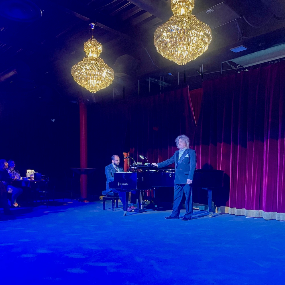 La interior, însă, în lounge-ul teatrului, încep să mă îmbunez. Sunt întâmpinată de două tinere în rochii roșii de seară, care mă îndrumă amabil către loc, bar și garderobă. Mă așez la o masă cu trei necunoscuți, un cuplu și o tânără, acompaniată de o mini-sticlă de vin roșu, ca cele pe care le poți consuma în aeroporturi (25 de lei, decent). În jur sunt familii, grupuri de prietene pensionare, cupluri de vârsta a doua — totul în decor de catifea roșie, candelabre sclipitoare și un somptuos pian de concert Bösendorfer.