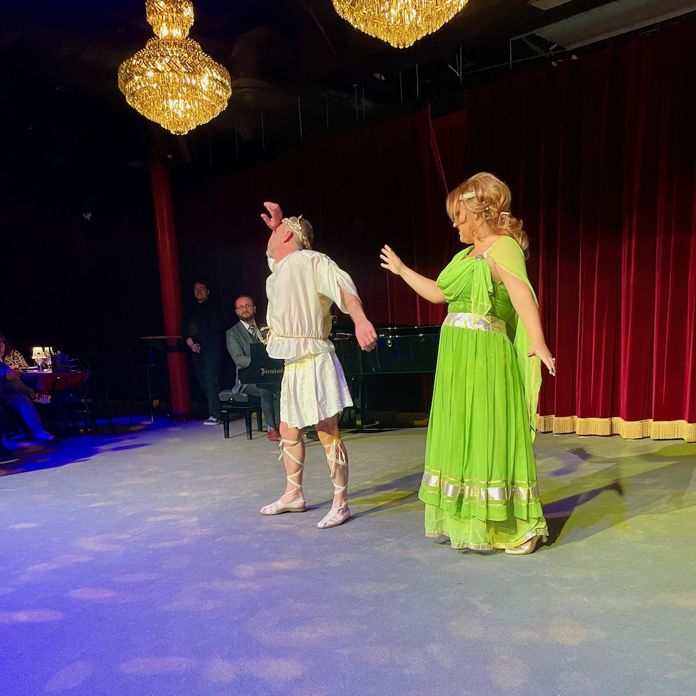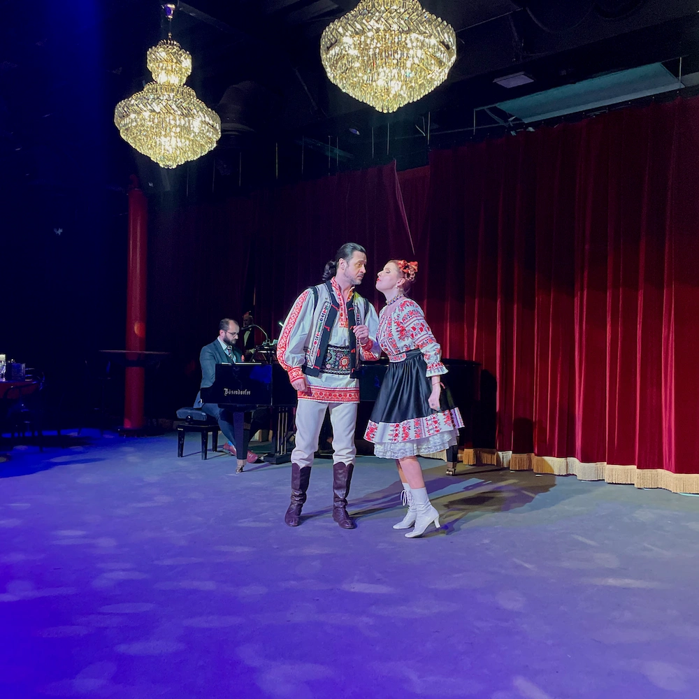 Conținutul spectacolului e, pe de-o parte, exact cum te-ai aștepta. Ținute clasice, pe alocuri ușor demodate, pantaloni cu vipușcă, fracuri, rochii de seară din paiete, machiaj intens de scenă. Femeile cântă exclusiv despre iubire, suferință din iubire, cătănie și iubire, dor din iubire etc.. Soliștii bărbați mai scapă la câte-un cântec despre dorul de țară sau răscruci de drumuri prin viață. Două momente rămân cu mine: unul comic, în care un solist joacă (bine) rolul unui rus bețiv, păcălit de un turc să-și înșele nevasta cu o cadână, doar pentru a sfârși pedepsit de respectiva nevastă. Și un altul de forță, în care o soprană e acompaniată de un cor de bărbați — povestea e că ea, o regină, îi poate domina, seduce și conduce oricând pe toți. Nu chiar feminism, dar e ceva empowering acolo. Și îndeajuns de mult camp încât să mă simt entertained pe bune.