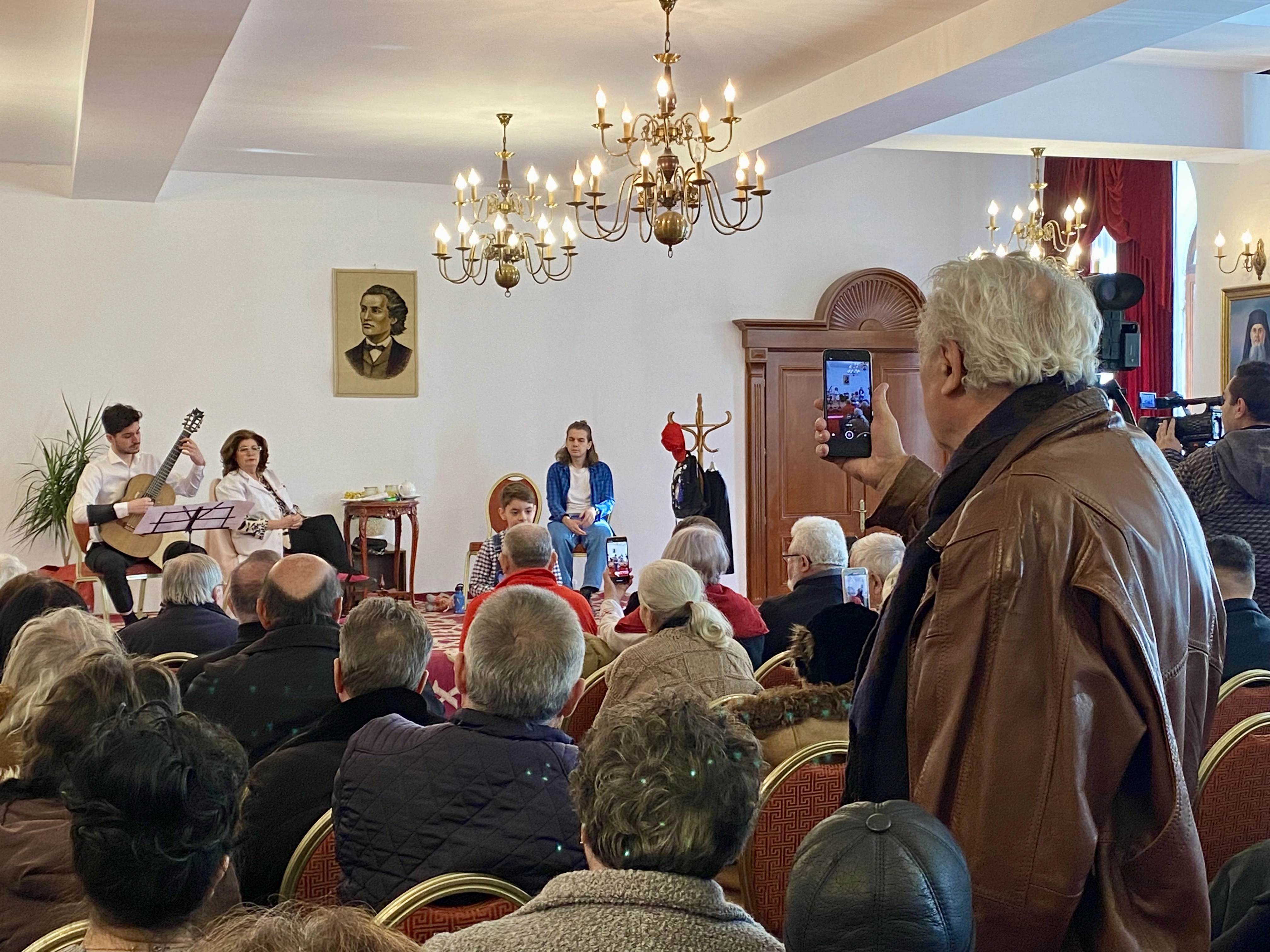 Afară, lângă bustul lui Eminescu și un șantier din care se ridică încă o clădire bisericească, se mai ține o mică veșnică pomenire, apoi suntem invitați în Centrul Cultural al Episcopiei, unde actrița Magda Catone a pregătit „un spectacol în premieră mondială”: Nepotul meu se crede Eminescu. În rolul principal, Rareș, copilul minune de 9 ani care a câștigat Românii au talent în 2023 pentru cum recită. Rolul din spectacolul regizat de Magda Catone – în care Rareș și-a păstrat prenumele real – e croit după pasiunea lui pentru recitat. E vorba despre un băiețel care e adus la psihiatru de unchiul lui, îngrijorat că Rareș se crede Eminescu. Unchiul zice că părinții sunt plecați la muncă în Italia și-n Germania, iar psihiatrul comentează cu aroganța celor care-i învinovățesc pe cei care își lasă copiii în urmă.