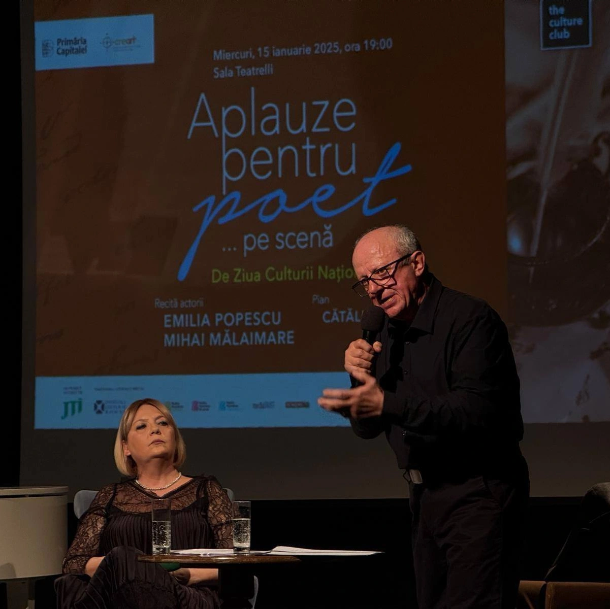 Ediția Aplauze pentru poet de Ziua Culturii Naționale (conceptul e prezent și online) i-a adus pe scena Teatrului Teatrelli (proiect finanțat de Primăria Municipiului București) pe Emilia Popescu și pe Mihai Mălaimare care au recitat poezii din Mihai Eminescu, George Topârceanu, Nichita Stănescu sau Emil Brumaru. Alături de actori, a fost și pianistul Cătălin Răducanu. Pe un ecran vor fi proiectate înregistrări cu alți actori, precum Ion Caramitru sau Victor Rebengiuc, care la rândul lor recită poezii.
