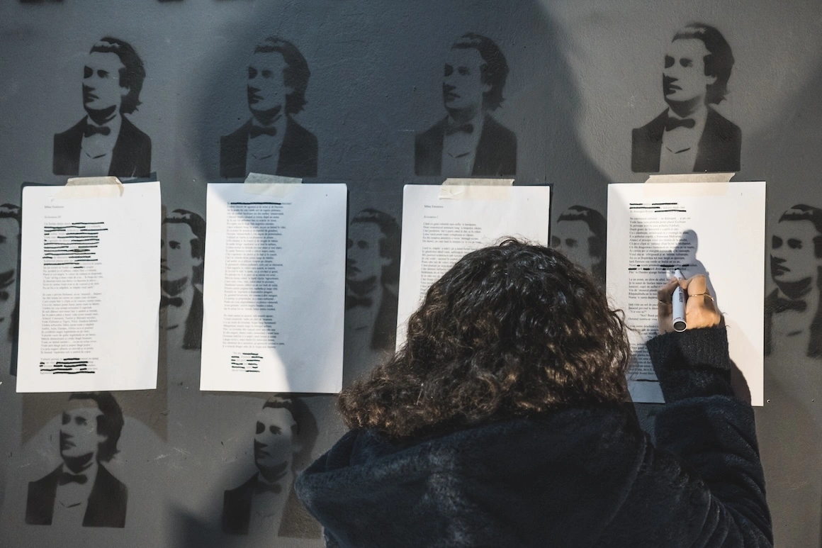 „Vrei să cenzurezi niște poezie?”, îi spune Paul unui tovarăș și îi dă un marker. Pe peretele din spate sunt câteva texte eminesciene din care deja au dispărut mai multe cuvinte. La final, după ce a fost operată de mai multe bisturii cu tuș negru, opera astrului renaște: „De ce pana mea nu dorm, dacă am cuvinte? De ce nu scriu, oare, azi, când sunt o beșică de nimic.”