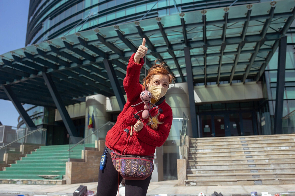 Am venit aici în semn de solidaritate cu artiștii independenți, să tragem un semnal de alarmă. Sunt și eu artist independent, șomer. Anul trecut am lucrat și pentru instituții. Obiectul pe care l-am adus e un nas de clovn. Eu nu sunt clovn. Oricât de grea ar fi situația, trebuie să facem ceva. Ieșim în stradă, facem ceva. Nu putem să așteptăm doar să se deschidă teatrele. Mi se pare absurd că teatrele sunt închise, chiar dacă s-ar putea, cu respectarea normelor, să se vină la spectacole. Înțeleg că nici schemele de ajutor nu s-au pus în aplicare și încă sunt discuții. De la noi trebuie să vină, să arătăm că chiar dacă nu ni se oferă șansa, încă suntem artiști.