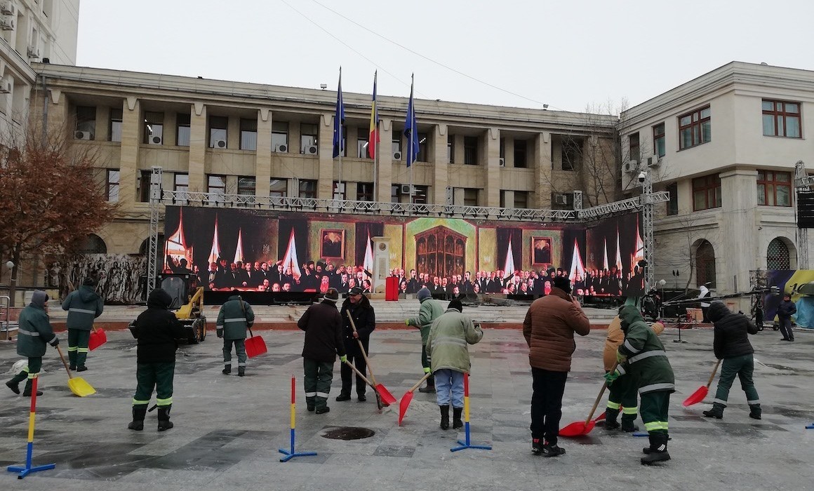Pe tărâmul baronului vrâncean Marian Oprișan, elevii sunt chemați să-și călească patriotismul pe-un frig teribil, iar cetățenii aduși cu autocarele la sărbătoare sunt ținuți departe de hora personalităților.