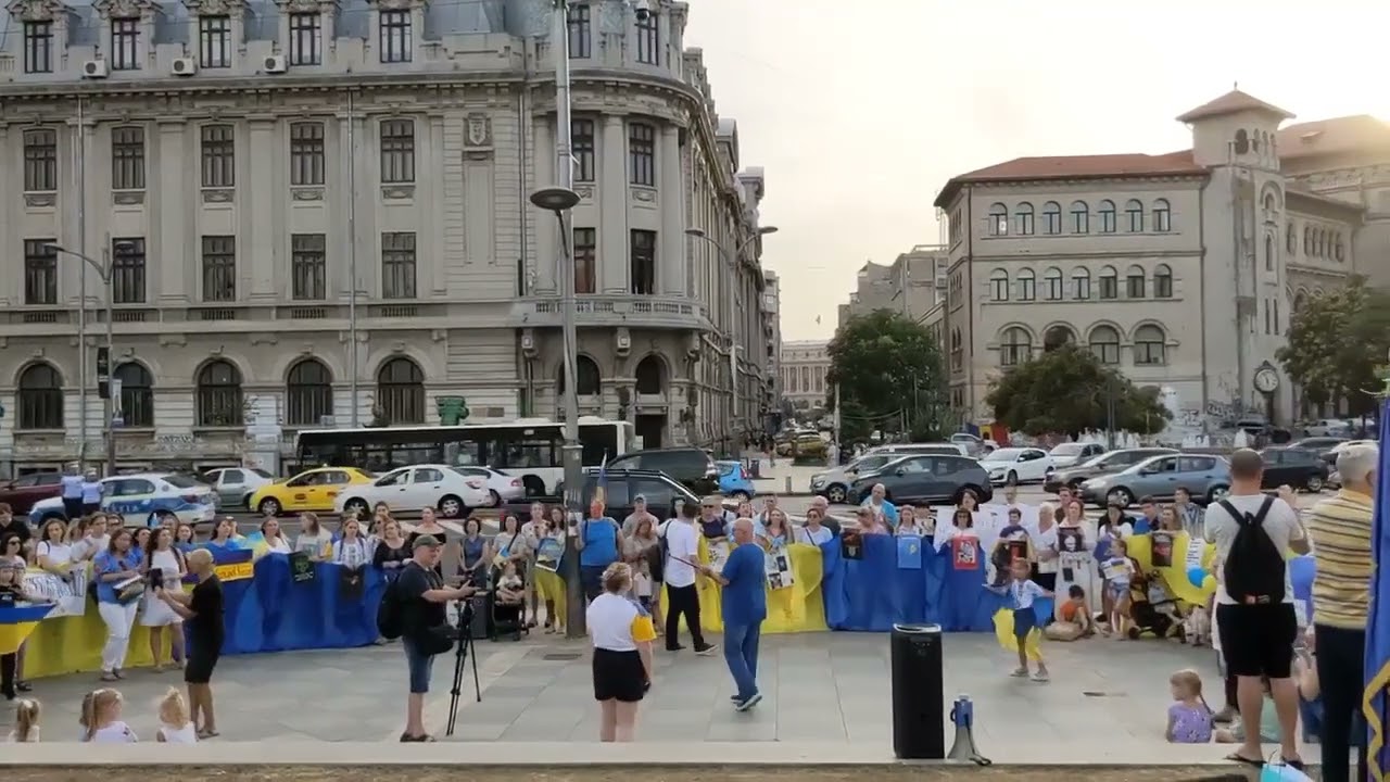 I recognized some of the slogans that entered the repertoire of pre-war mass perturbations in Ukraine, while others were new, and some were evidently improvised. I wonder how many ‘lay’ participants had their first street demonstration experience here at the University Square, or whether they learned most of the slogans from the media. The engagement of the surrounding mass dropped from the middle to the outskirts of the gathering. There I noticed Ioana, who only dropped by for the beginning of this demo to later return to the dancing show. We exchanged greetings of two people at work, our paths parted to bring you a fuller picture of Ukraine’s Independence Day in Bucharest.