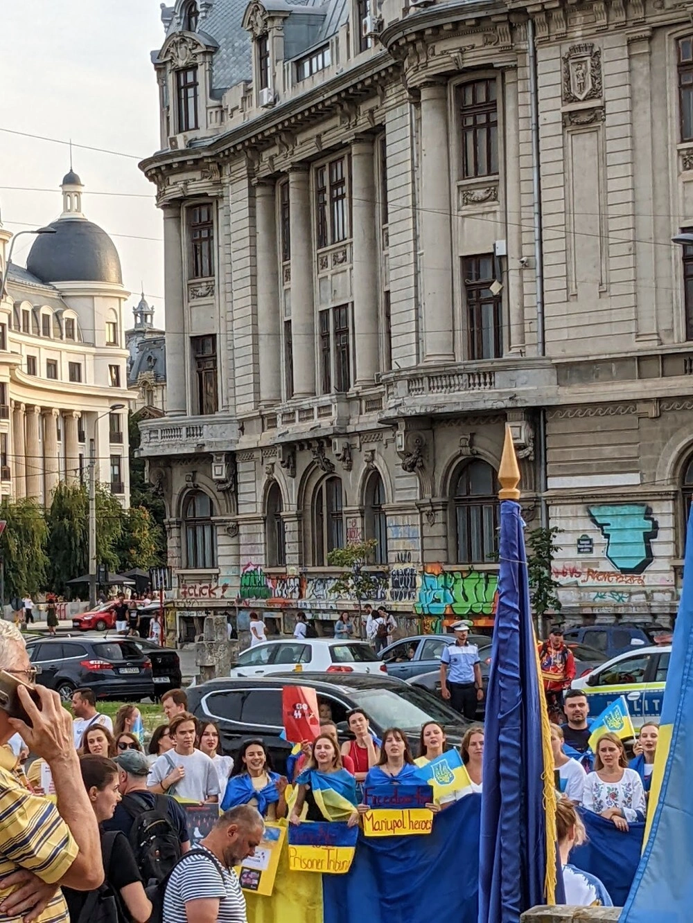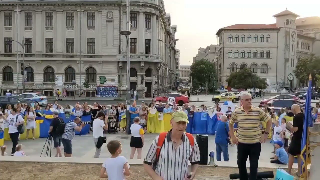 I chose the demonstration at the University square on purpose, as I saw an ad on one of the Facebook groups for Ukrainian refugees in Romania. I was intrigued by the co-organizer of the event, the "21 Decembrie 1989" Association. As my Romanian wife explained to me, it was an old political group, tracing its roots from the students’ protests during the 1989 revolution, and now enjoying controversial fame for its conservative-nationalist agenda. The meeting between highly politicized Romanian organizers and Ukrainians who gather on the occasion of the Independence Day, at a time when Ukraine’s independence is in mortal danger, promised a glimpse into a political self-representation of Ukrainian migrants. There, the celebration of the Ukrainian Independence Day would confront the site of the most iconic Eastern European 1989 revolution. The destination of the march, the Russian embassy in Bucharest, promised an emotionally heightened culmination of the event.
