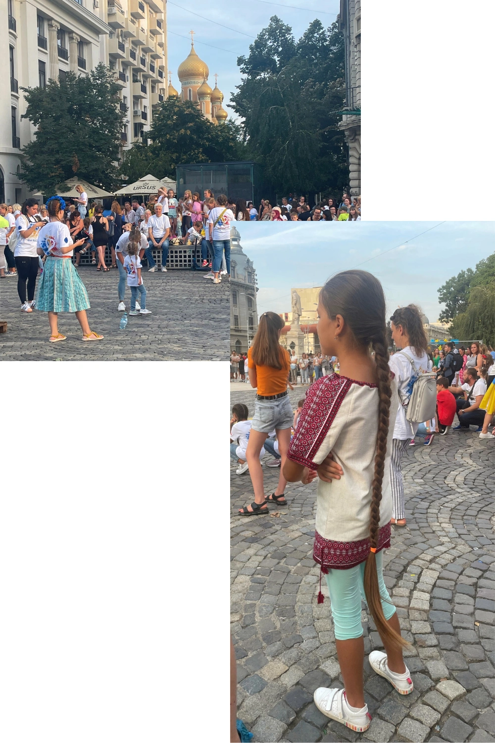 The celebration starts with a group of young women and children singing the Ukrainian National Anthem, Ще не вмерла України і слава, і воля. Like many who only searched for its meaning this year, I was struck by its first words, which are literally “Ukraine has yet to perish.” It resounds throughout the square and there’s an eerie silence around, as if this bustling, central space in Bucharest that never shuts up has suddenly frozen in time. I film the moment and the people around me, most of them women and children, who are mouthing the lyrics, hands to their hearts.