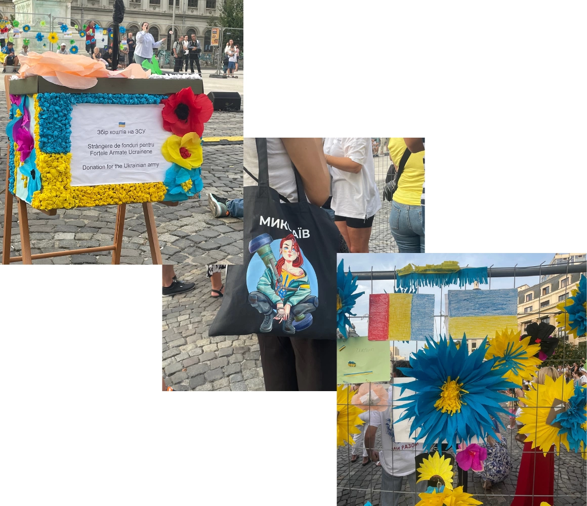 There’s about a hundred or so people here and I hear no Romanian whatsoever being spoken, with the exception of a TV reporter interviewing one of the organizers. Children are playing in a space delimited by riot fences that have been tamed by the addition of children’s drawings, paper flowers, and posters expressing slogans of Romania’s solidarity. Front and center, there’s a donation box for the Ukrainian Armed Forces. All around, there’s a significant number of Romanian riot police officers, in their black military uniforms. What was announced on Facebook as a flashmob, but will soon turn out to be a full-fledged show, has yet to begin.
