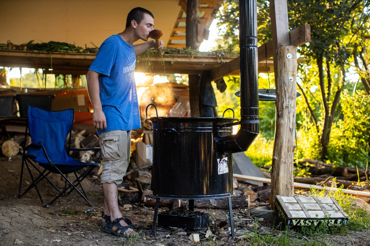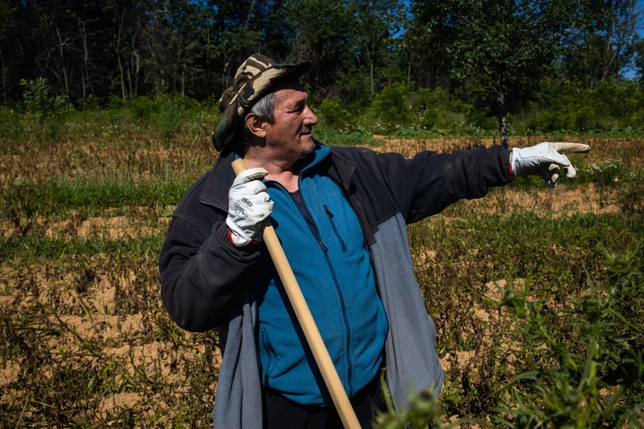 The sky is orange at sunset and we’re heading toward the home of Damia, the newest Children of the Sun community member. She lives here with her partner, Marius Căpîlna (Sică), and Amza, their one-year-old son. We walk through a pine forest, where you can sometimes come across wild boars, and Damia touches a juniper, which she tells me is used for making gin. That’s one of the many things she’s learned out here, along with recipes for syrups, jams, plum brandy, floral water, or sundried tomatoes. Sică stops to saw off some hazelnut branches, which he uses as poles to prop up the tomato and bean vines. He enjoys digging, planting, building, “anything that helps other people come here and meditate,” says the 23-year-old with a boyish air, and a perpetual smile on his face. “Living out here is fulfilling, if you see these things as a step in your evolution, ‘cause it ain’t easy.” In the winter snow needs to be shovelled off the houses and greenhouses, the firewood needs chopping and the fire needs building. During the other seasons, there’s farmwork to be done, sometimes for as long as twelve hours a day.