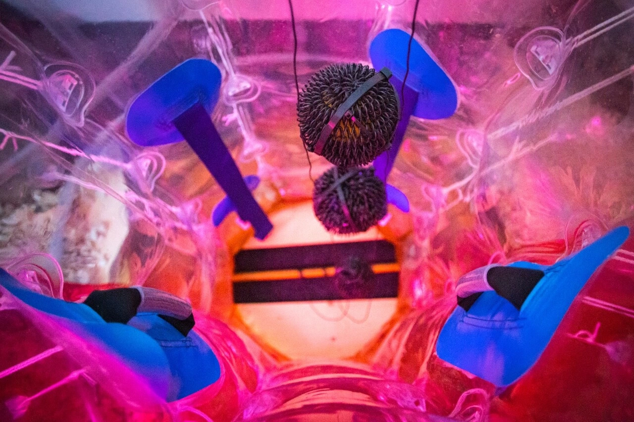 In the middle of the meditation hall, there’s a blue semitransparent plastic sphere, about 10 feet in diameter. It looks like a gigantic beach ball. Adi tells us that’s an Ark he built himself and that its powerful force balances people’s electromagnetic fields. He informs us it’s the first time he’s testing it out in class. “I’m glad no one died,” he adds jokingly. A few giggles in the room, a few puzzled looks around; I burst out laughing. But what if this Ark is dangerous?