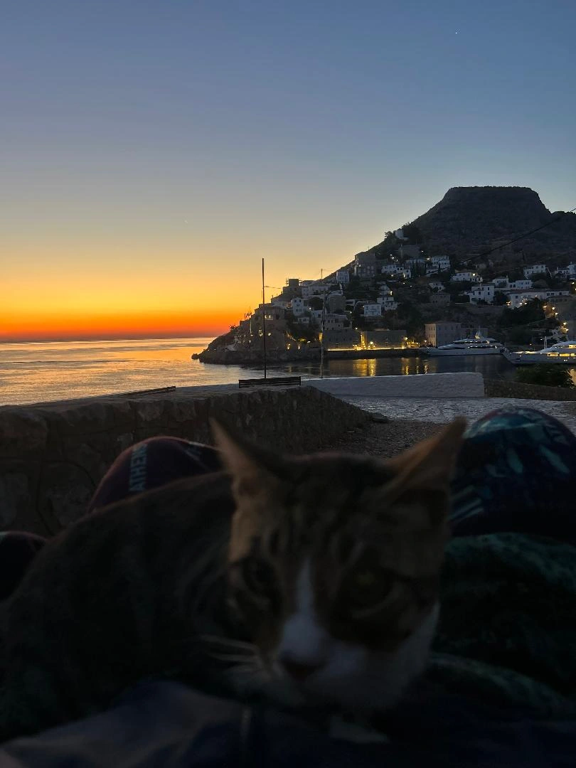 On the first night, I slept on the beach. Out of nowhere, just as I closed my eyes, a cat curled up against me and wouldn’t leave. Early in the morning, when the first swimmers arrived, I moved from the beach to a nearby cart. The cat followed and nestled into me again. It watched the sunrise from my arms. It seemed to want to show me that Hydra was welcoming — but in its own special way.