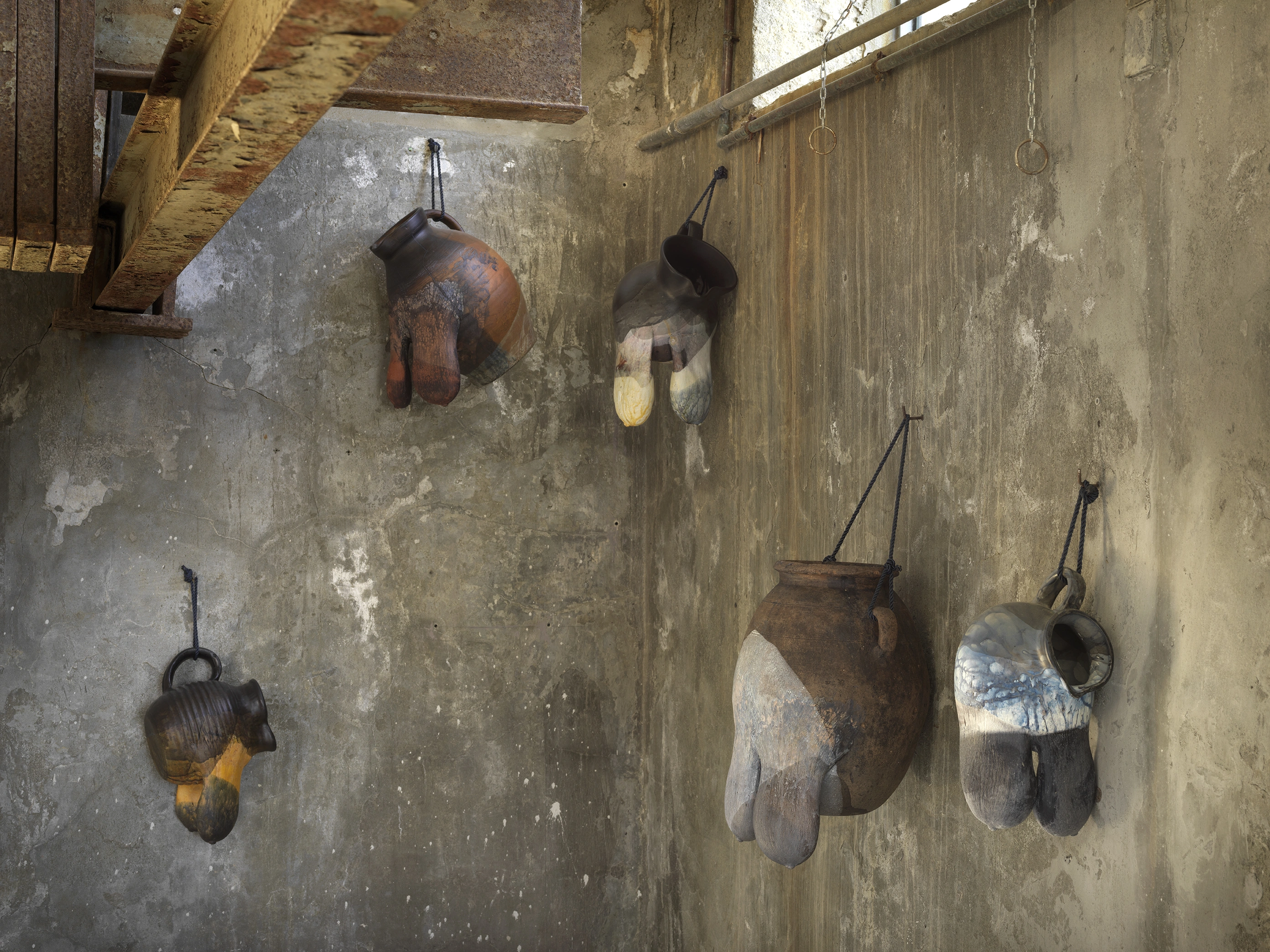 Clay pots with breasts are hung on the walls of the slaughterhouse, an installation called Atrophy Room. The pots contain oil and, like breasts, may also contain milk. They are carriers of life with stretch marks.
