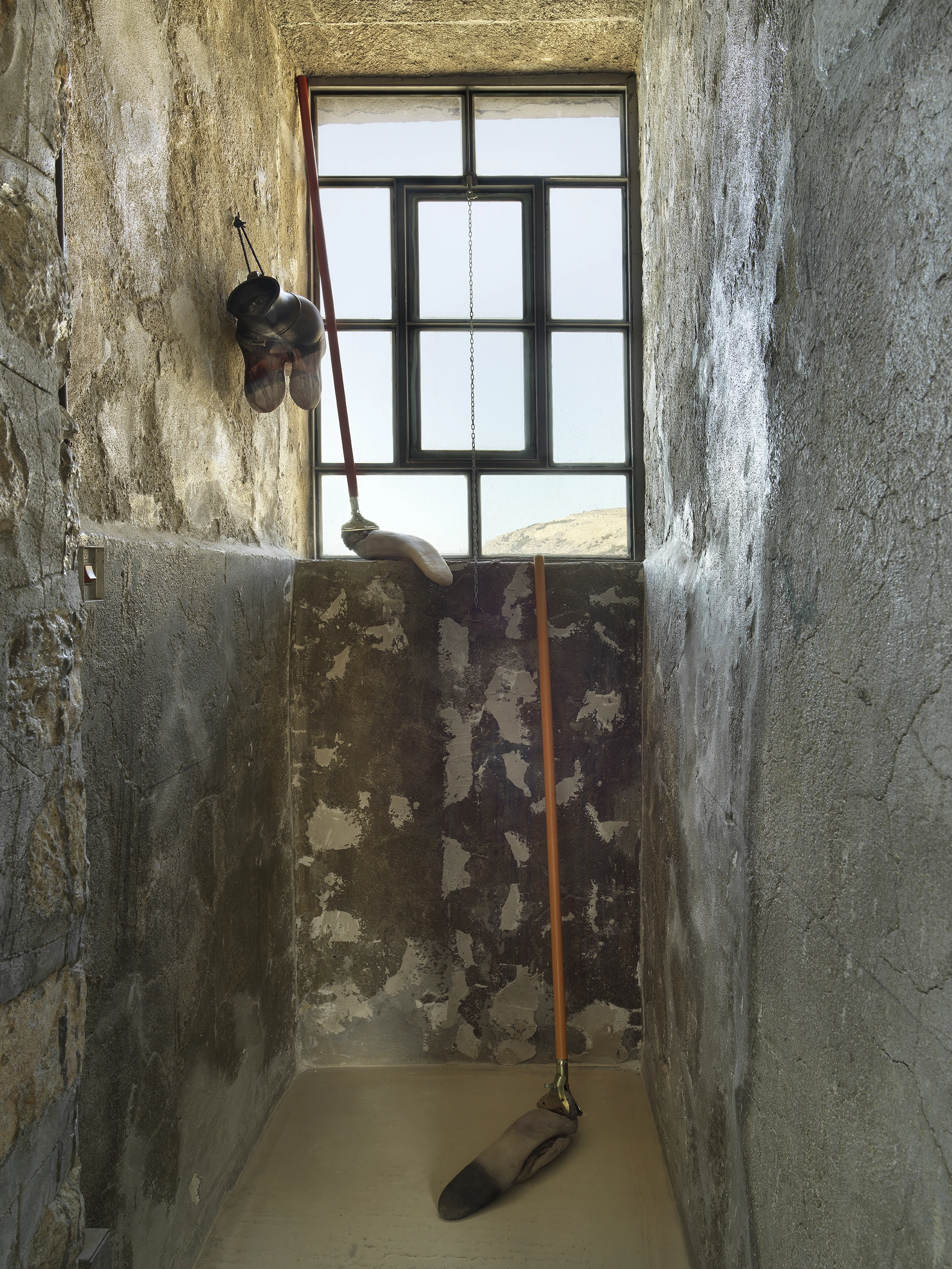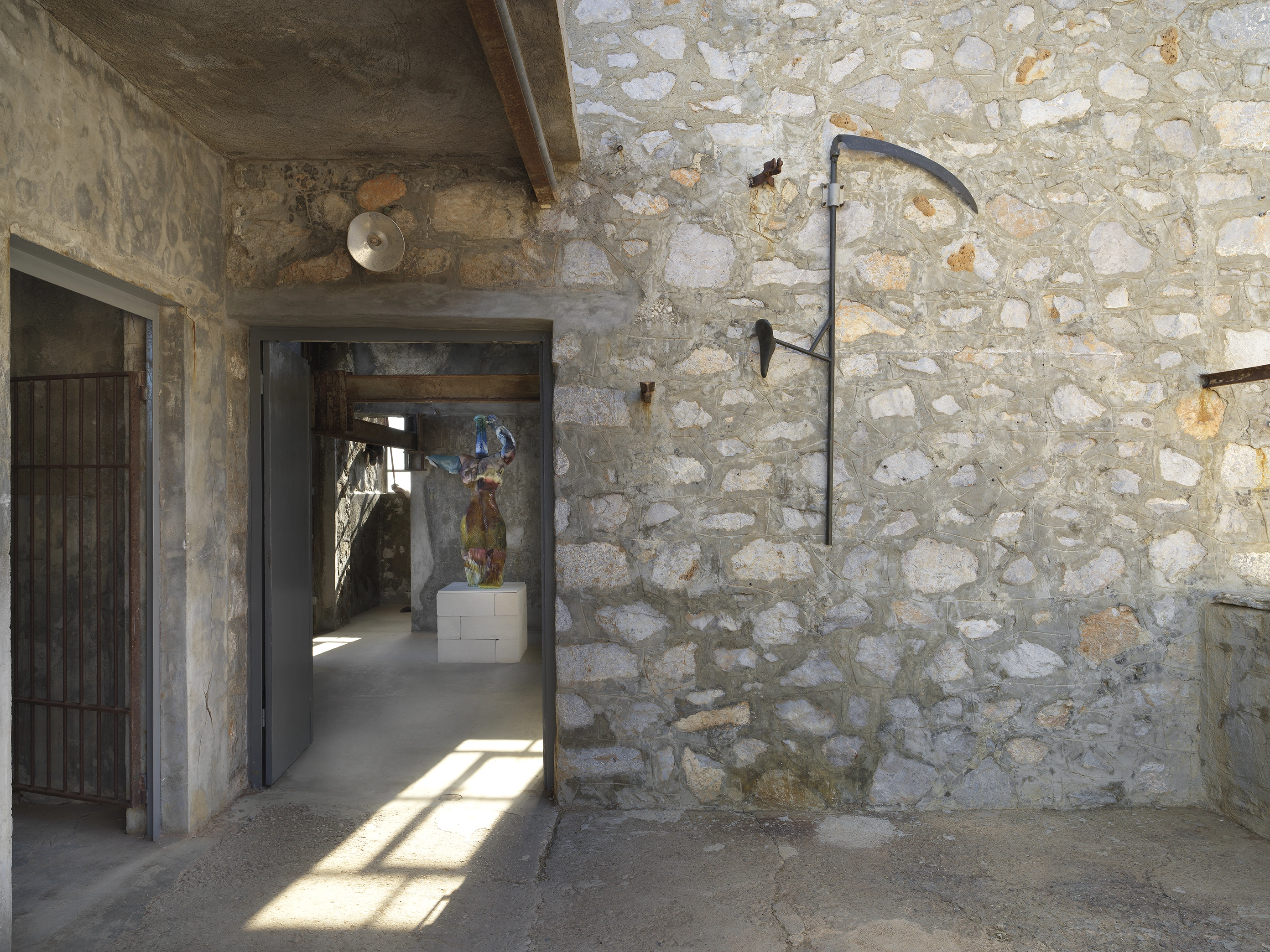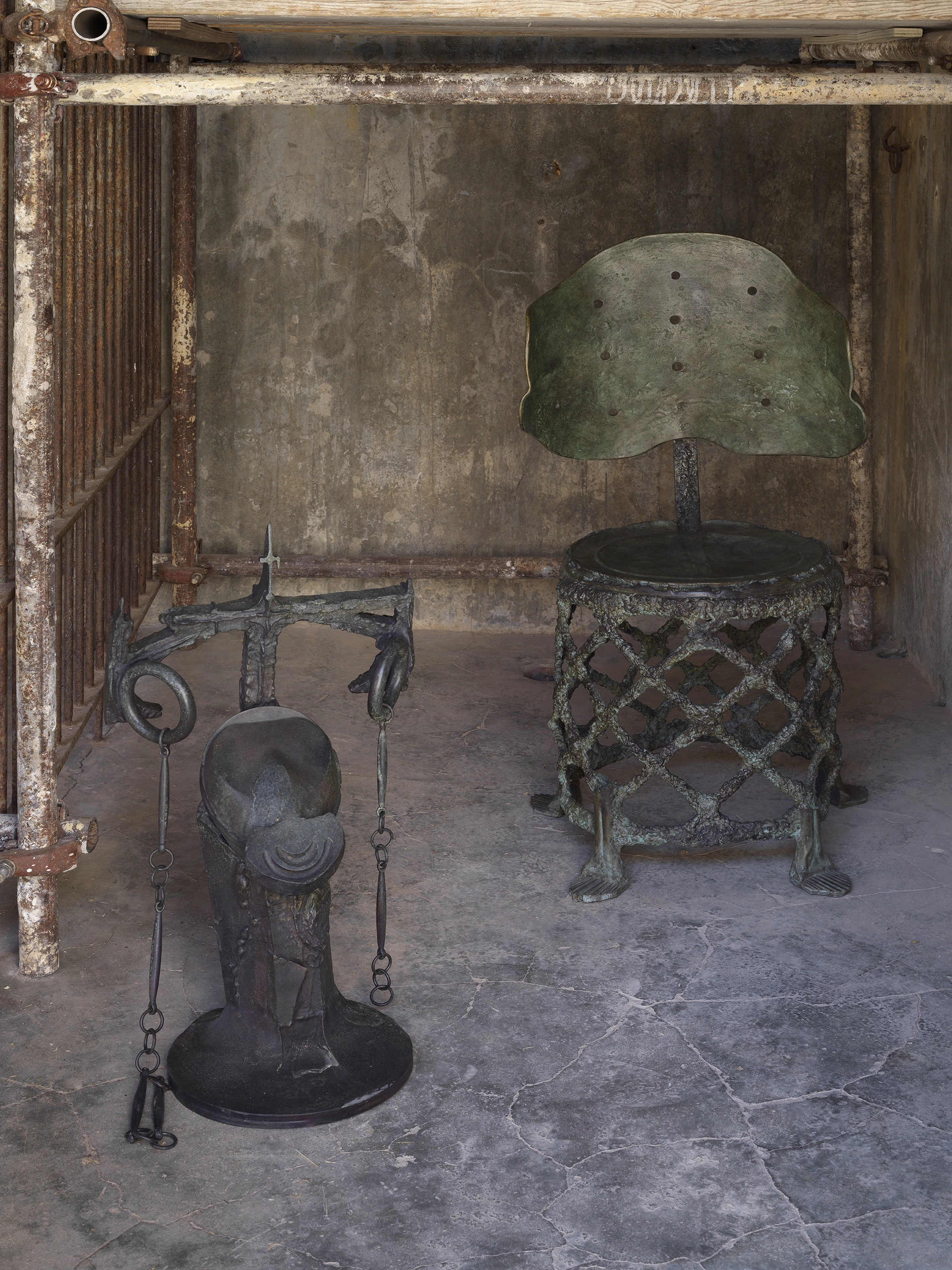 An extension of the former slaughterhouse on Hydra is divided into three cells where animals used to be kept awaiting death. These small spaces now display works united by the common theme of violence and death. Some of the works are part of a series called Desolation Ware and consist of bronze sculptures cast using the lost wax technique. They are the traces of a civilization that cannot be placed in a specific time period, as it uses technologies from several eras, even ones that have not yet happened. The artifacts seem to come from Atlantis, as if they had just been unearthed in Antikythera. Whether they are pieces of furniture or ceramics, these sculptures speak of violence and ἀνάγκη – necessity or the torment of destiny. But the ornamental bronze chairs, resembling thrones, evoke hierarchy: control and submission. The artifacts seem to have survived a violent event and thus constitute the memory of a civilization that has collapsed – or will collapse. All this is presented by Ursuța, of course, against the backdrop of an impression that we may be witnessing the decline of one order and the rise of another. The violence reflected in her sculptures is both a testimony to the merciless fate of Greek mythology and to the psychological violence of our times, as described by philosopher and cultural theorist Byung Chul-Han: the subtle, internalized pressure to achieve, which leads to exhaustion. A somewhat anthropomorphic metal device looks like both an instrument of torture and the scales of justice of the goddess Nike. The "Byzantine" vessels, filled with food or drink, could just as well be bombs.