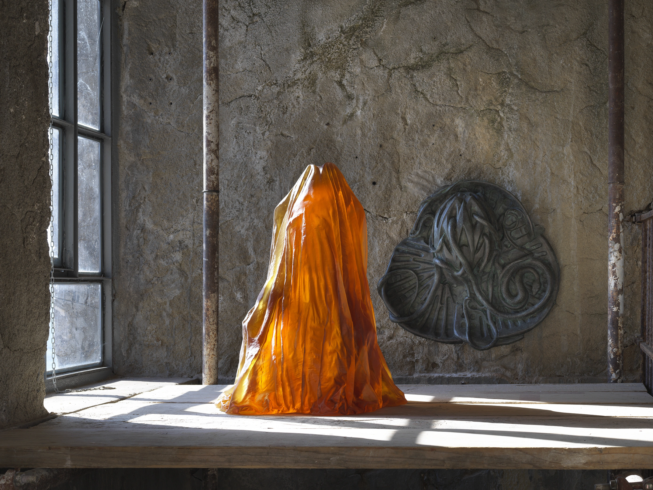 Two interconnected works caught my attention the most. One, Grande Odalisque, made of orange cast glass, features a veil that seems to cover a skull. In itself, it evokes the mantilla, the mourning dress worn by Andalusian women during Holy Week. However, the title, borrowed from Ingres' painting, forces us to consider the difference between fertile, vibrant youth and emaciated old age. Ingres' sexy young woman turns her back on us. She has no more than a second to meet our gaze: in the next moment, she will return to looking ahead. After all, as philosopher Ulrika Carlsson comments, she has a civilization to build. We, looking at the eye sockets suggested behind the orange glass veil, are reminded of the honey traps that appear in various stories —- the illusion of a sensual young woman, concealing a body touched by decay.