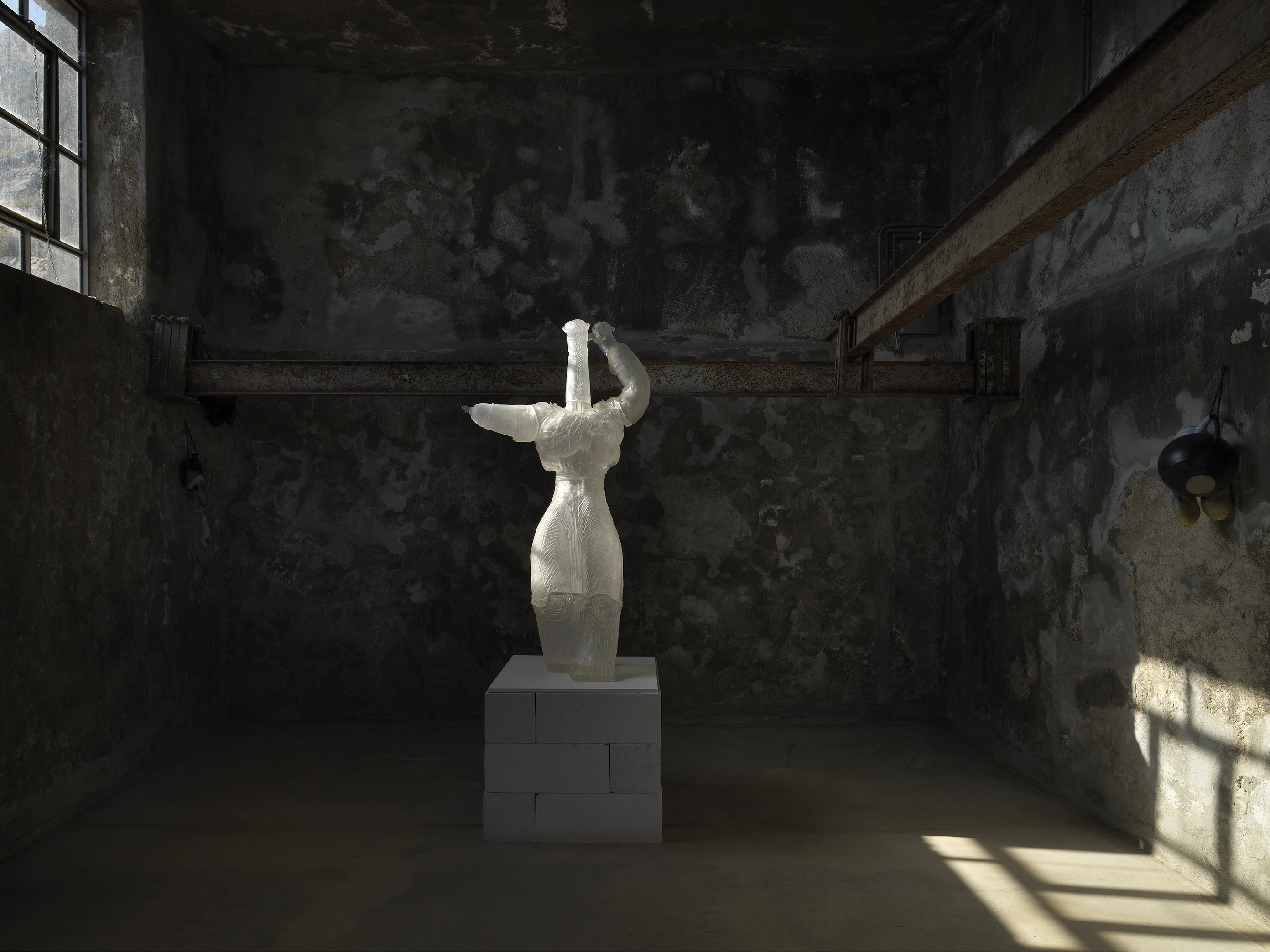 Apocalypse Then and Now is an exhibition that "meditates on a barrier." It was conceived as a personal exploration of an ancient matriarchal civilization and its decline. Andra Ursuța's sculptures resemble assemblages, in which parts of the artist's body or those of her loved ones are found among the broken elements. The meanings of their titles are fragmented. "All the works contain a little alcohol," the artist confessed during a press conference held at the cinema on Hydra and moderated by curator and art critic Massimiliano Gioni.